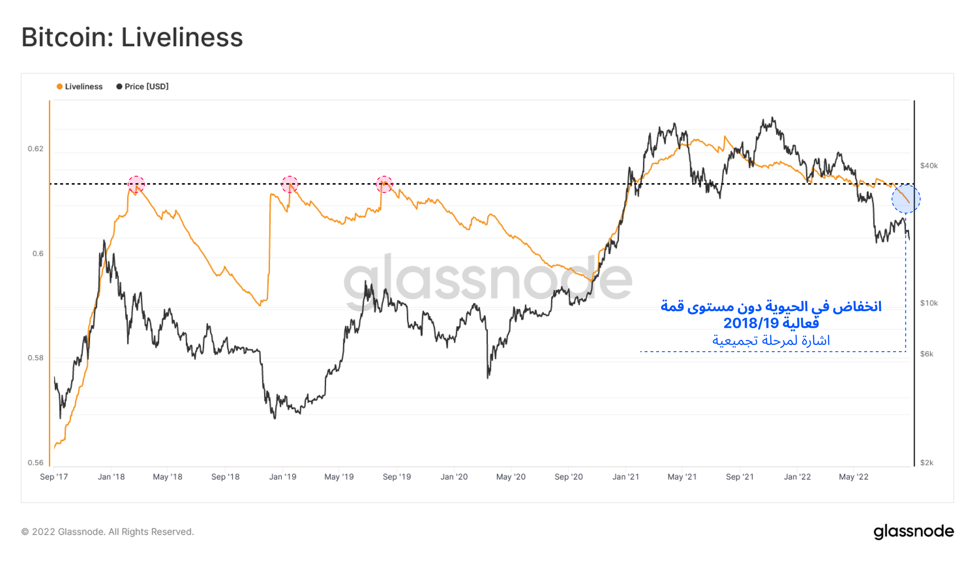 يعتبر مؤشر ال Liveliness في اتجاه هبوط قوي. وقد إخترق بشكل واضح القمم الثلاثيه للسوق الهابط لما بعد 2018 يشير هذا الحدث إلي أن عملات البتكوين تتراكم من خلال العرض بشكل أكثر بكثير مما يتم تدميرها " شراء" .