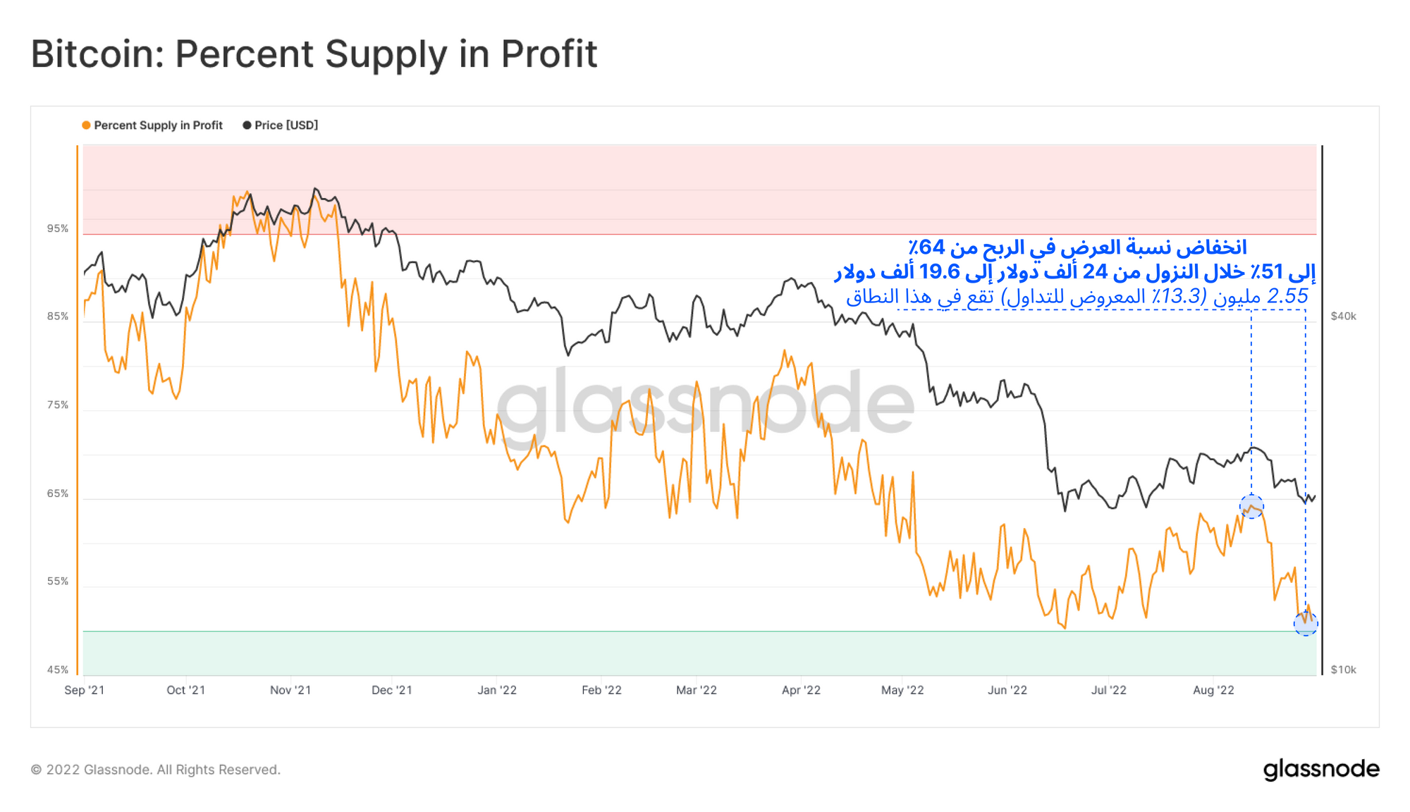 بالتالي ، يمكننا ملاحظة أن 13.3٪ من العرض المتداول خسر وضعه المربح أثناء التحرك هبوطيًا من 24 ألف دولار إلى 19.6 ألف دولار. يشير هذا إلى أن 2.55 مليون (13.3٪) من العرض المتداول تم التعامل معه مؤخرًا ضمن هذا النطاق السعري.