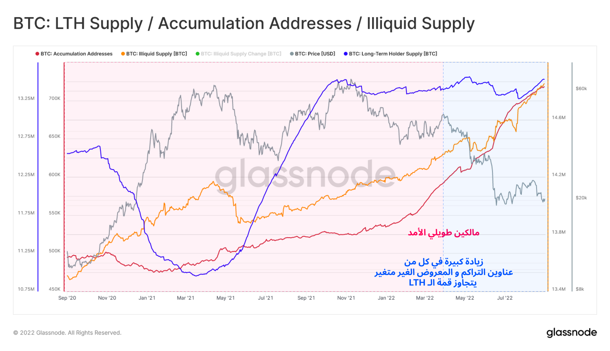 يمكننا أيضًا مقارنة المعروض من LTH بعدد عناوين التراكم والمعروض الغير متغير، للحصول على رؤية أكثر شمولاً للتغيرات المحتملة في ديناميكيات العرض. نلاحظ أن المعروض الغير متغير يتم تعريفه على أنه بيتكوين محفوظ في محافظ ذات تاريخ إنفاق ضئيل أو ليس لها سجل إنفاق. عناوين التراكم هي تلك العناوين التي تلقت أكثر من دفعتين ، لكنها لم تنفق مطلقًا.