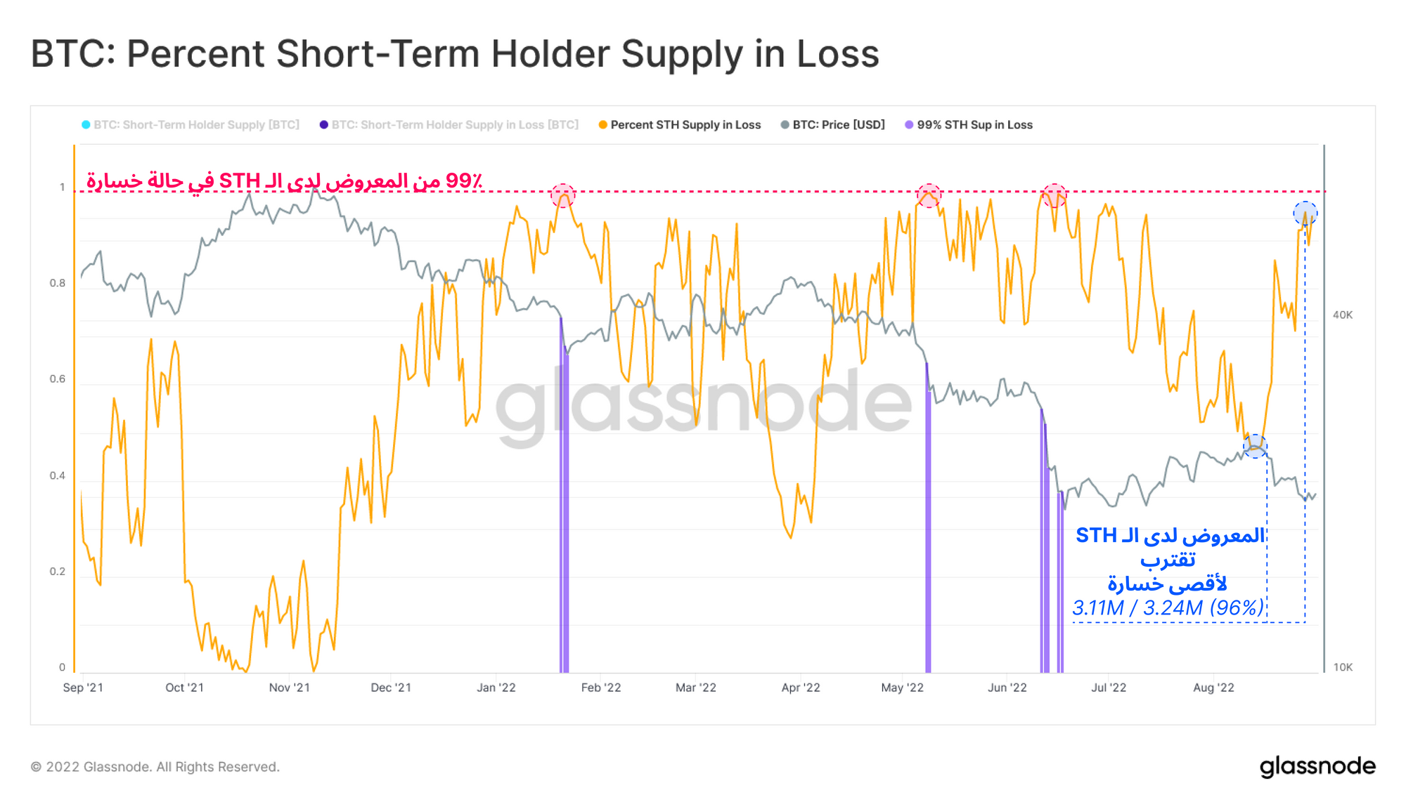 هذا يجعل المعروض من البتكوين بحالة خسارة يصل لمرحلة التشبع مع نسبة 96% من عملات المستثمرين قصيرين المدى بحالة خسارة . حيث تشبع كامل بالخساره خلال ثلاث مناسبات في دورة السوق الهابط الحالية . والذي يميز بشكل واضح أحداث تشكيل القاع الحالي للبتكوين وهذا الواقع هو نتيجة للإستسلام حيث يقوم يبيع مستثمرين قصيرين المدى إلي مستثمرين أخرين قصيرين المدي في إستغلال لتذبذب سعر البتكوين للمضاربة .
