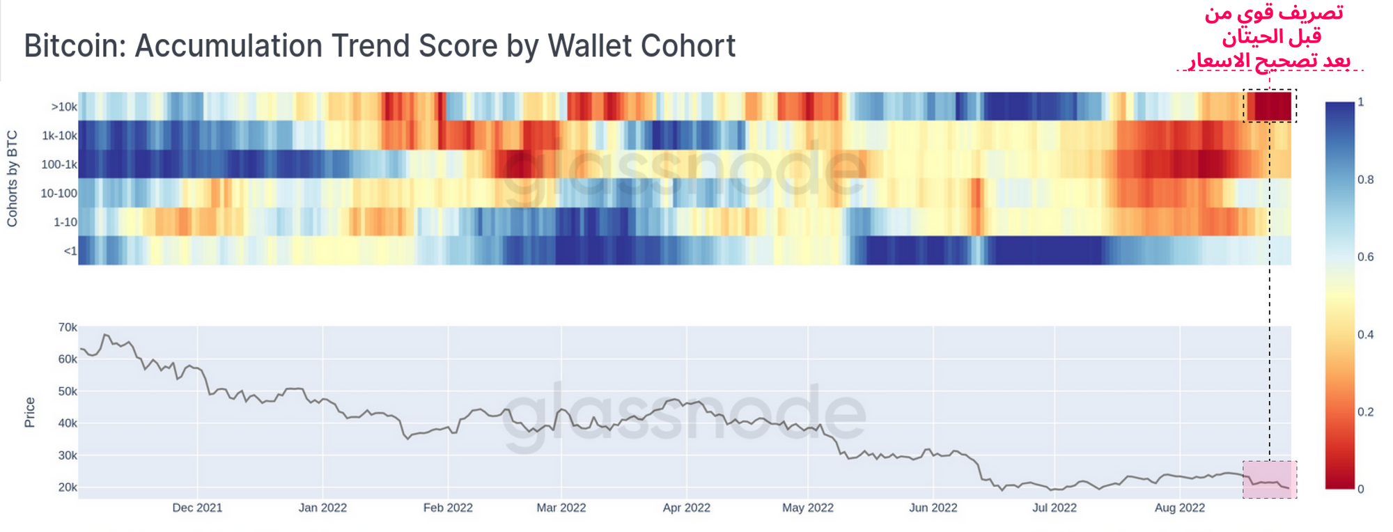 يمكننا ملاحظة إنعكاس صارخ للسعر نتيجة لعمليات البيع ووصول السعر إلي 17,6k ألف دولار . حيث إنعكست تحويلات الحيتان إلي المنصات بهدف التصريف ورأينا تم الوصول لذروة التصريف "البيع" من قبل الحيتان حينما وصل سعر البتكوين إلي 24,5k ألف دولار أمريكي ويشير التحليل بأن الحيتان أصحاب المحافظ التي أعلى من 10k بتكوين هم العامل المهيمن حاليا على عمليات التصريف " البيع" .