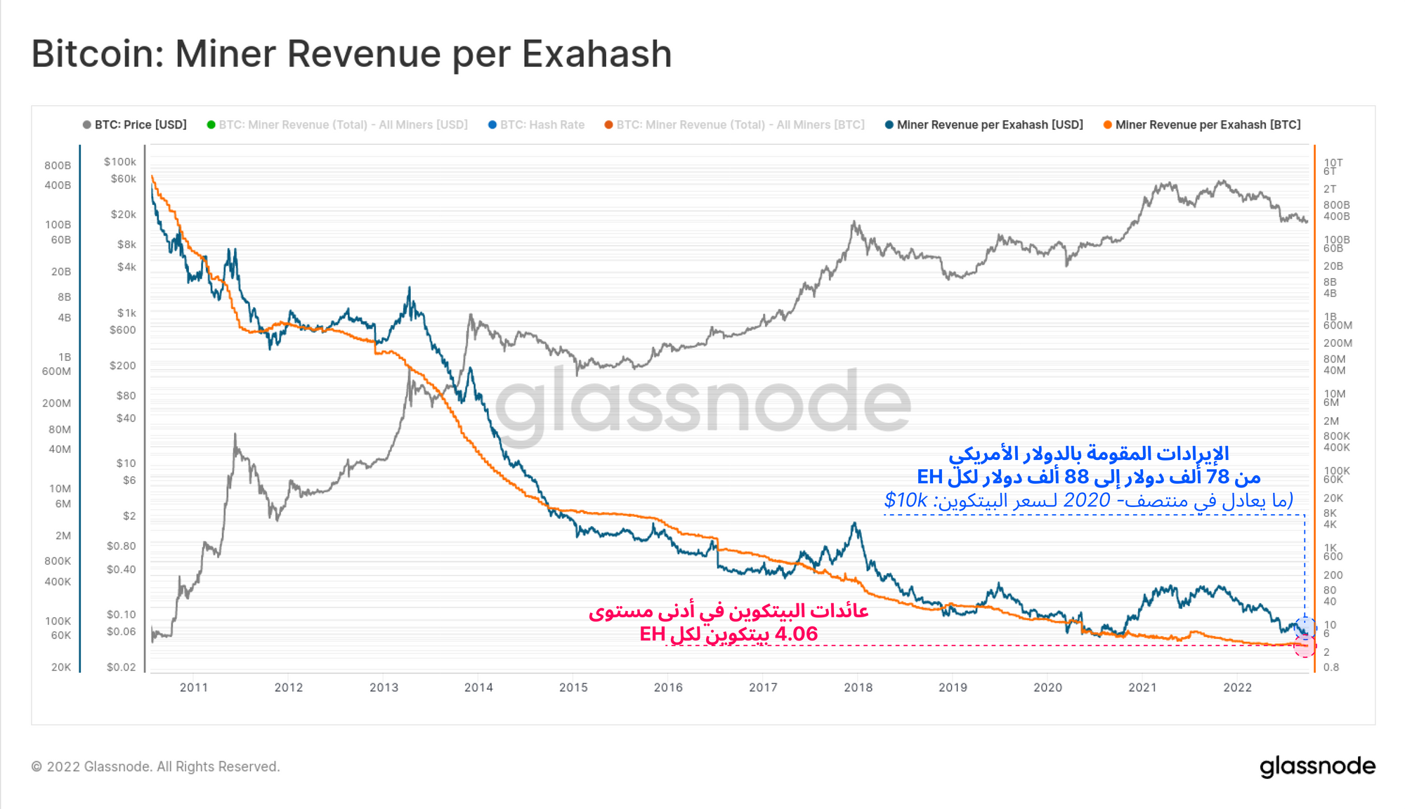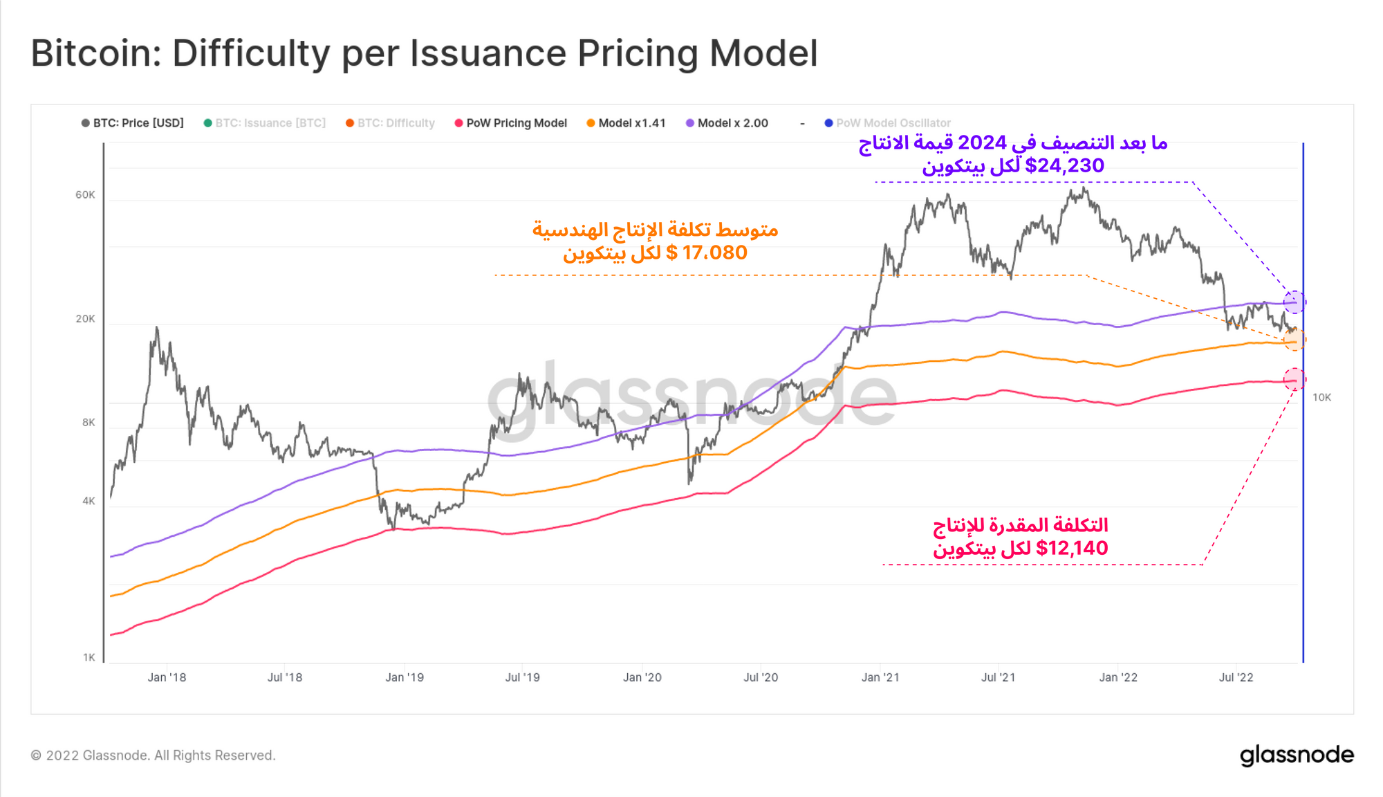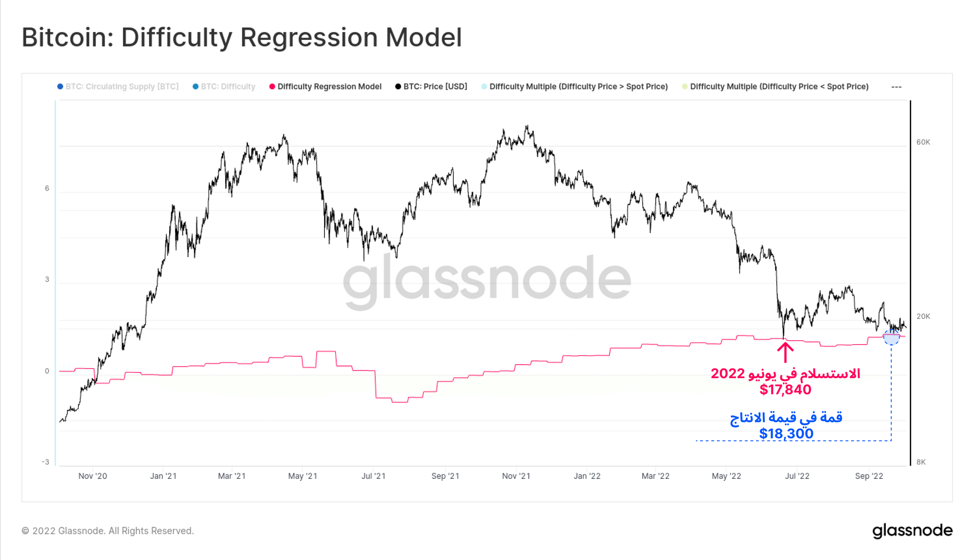 ولكن نموذج Difficulty Regression أحدث هذا النموذج تقاطعا مع أسعار البتكوين الفورية "Spot" لسعر 17,840 دولار أمريكي في أدنى مستويات السعر في يونيو 2022 وحاليا يحوم السعر حول 18,300 دولار أمريكي وهو أقل بقليل من مستويات سعر السوق لهذا الأسبوع. وذلك يشير بزن المعدنين يتعرضون لضغط ومن المحتمل يزيد الضغط من هبوط سعر البتكوين.