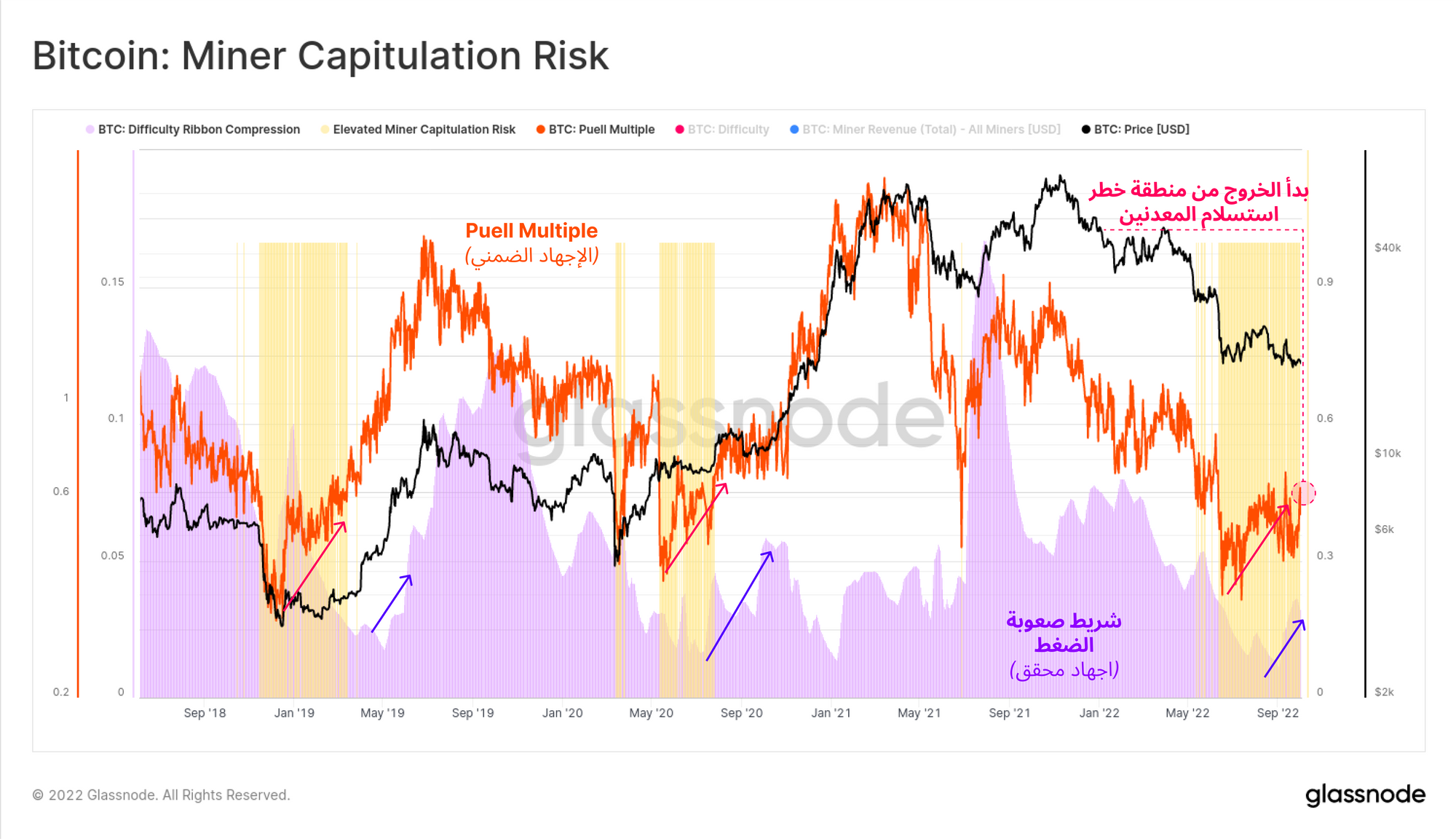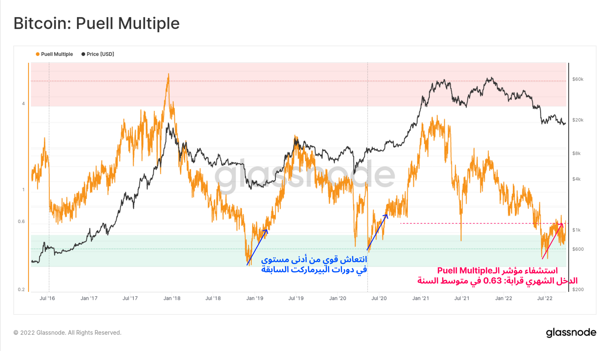 سنستخدم مؤشر ال Puel Multiple وهو مؤشر يقيس عائدات التعدين اليوميه الحالية مع متوسطها السنوي بلغ معدل هذا المؤشر إلي أدنى مستوياته الحالية عند 0,33 في يونيو الماضي. مما يشير إلي أن المعدنين كانوا يكسبون 33% فقط من متوسط إيراداتهم السنوية وقد تعافى من ذلك الحين إلي 0.63 مما يعني بأن المعدنين يحاولون التكيف مع أسعار البتكوين الجديدة.