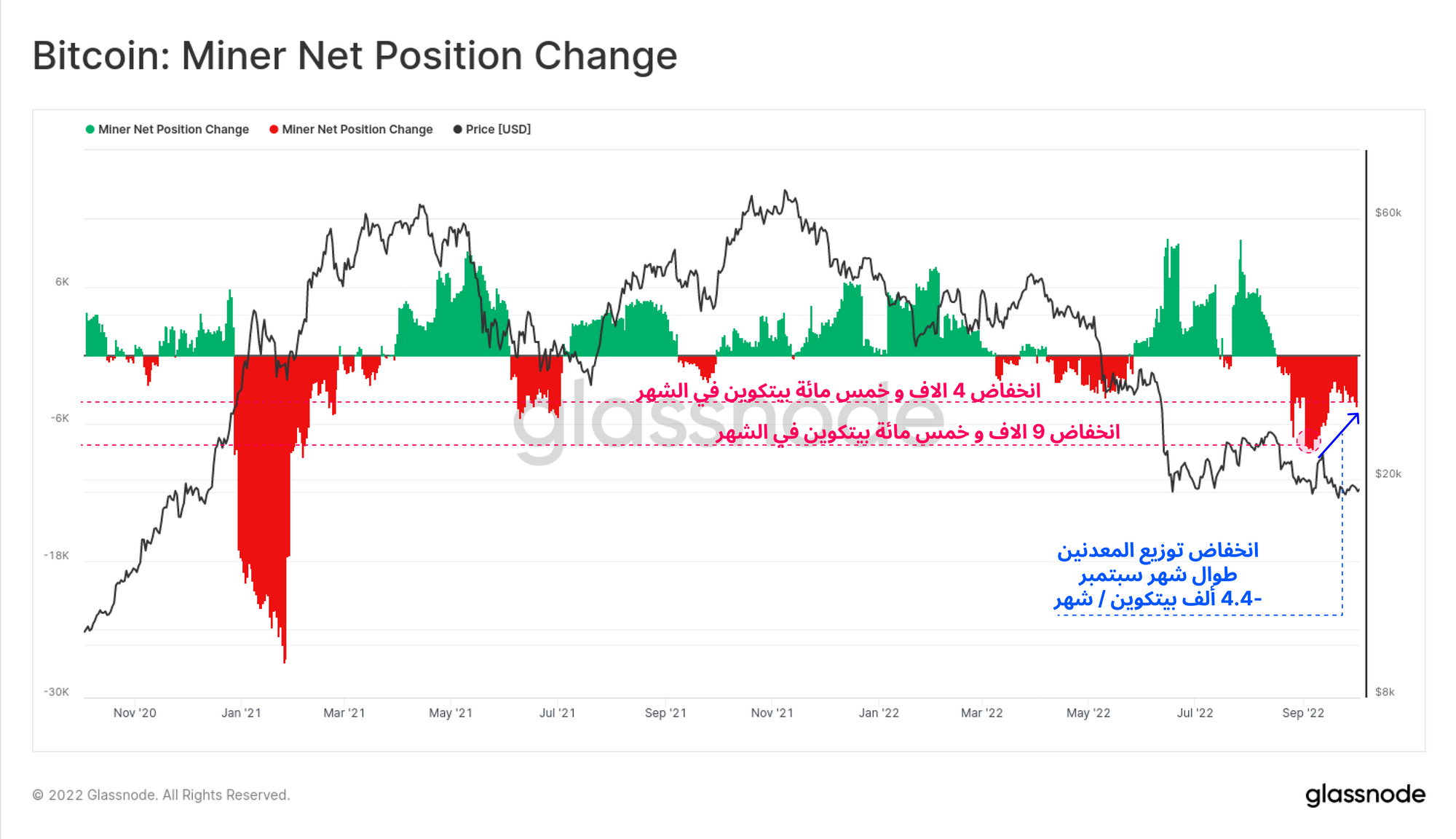 لوضع اللمسات الأخيرة على تقييمنا ، نتطلع إلى أنماط توزيع العملات الفعلية للمعدنين لمعرفة التأثيرات على ثرواتهم من البيتكوين الإجمالية. الرسم البياني أدناه هو التغيير لمدة 30 يومًا في محافظ المعدنين ، وبينما تباطأ التصريف ، فإنه لا يزال عند مستوى 4.5K بيتكوين شهريًا. ومع ذلك ، يمثل هذا انخفاضًا بنسبة 50٪ منذ الذروة في أوائل سبتمبر.