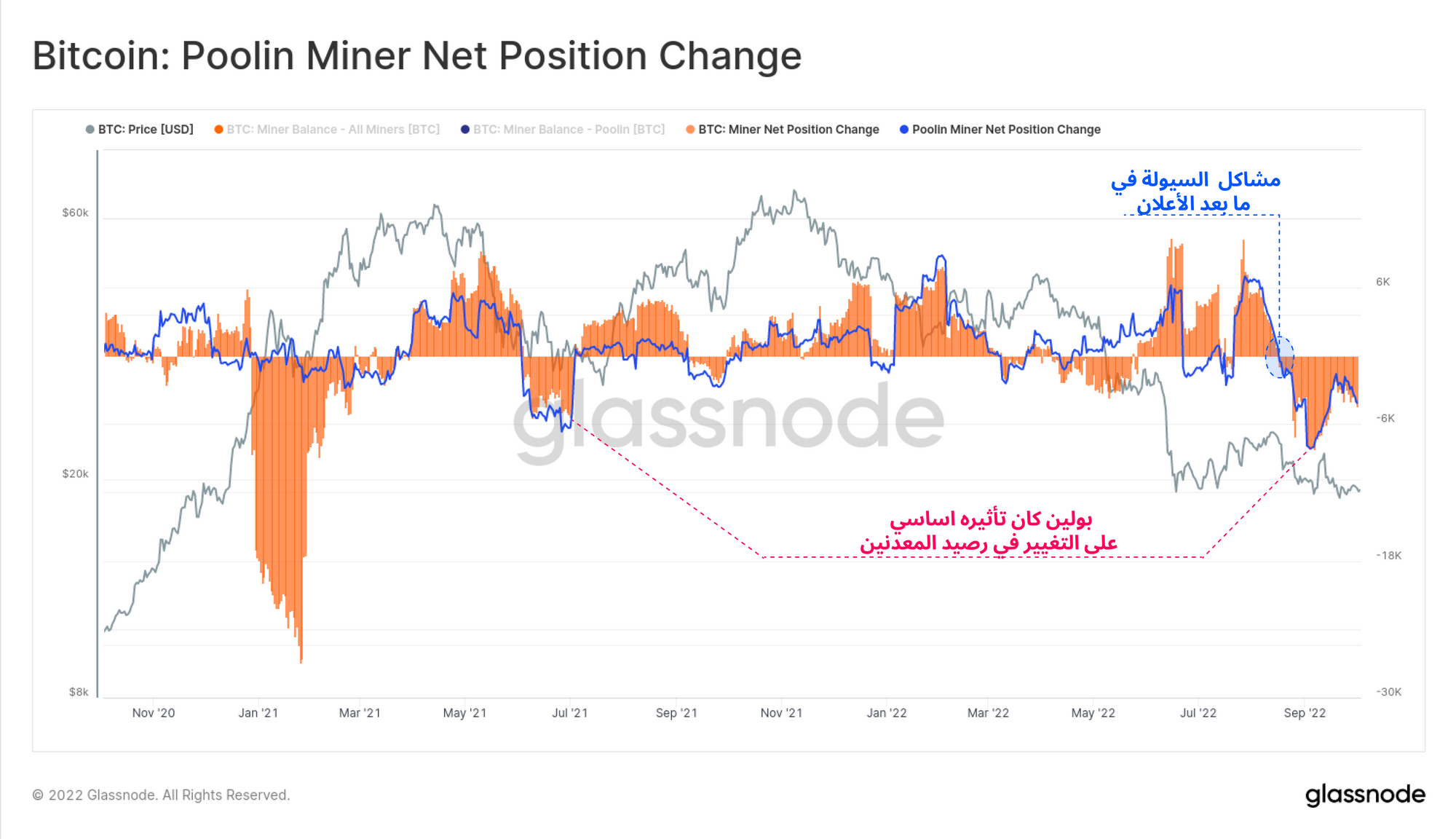 ومع ذلك ، عند التعمق في هذا الأمر ، يمكننا تحديد أن الغالبية العظمى من التصريف يتم الحصول عليها من المعدنين المرتبطين بـ Poolin. يُظهر المنحنى البرتقالي أدناه صافي التغيير للمعدنين لمدة 30 يومًا ، في حين أن المنحنى الأزرق خاص بـ Poolin ، مما يدل على أن كل البيع تقريبًا مرتبط بهذه المجموعة.