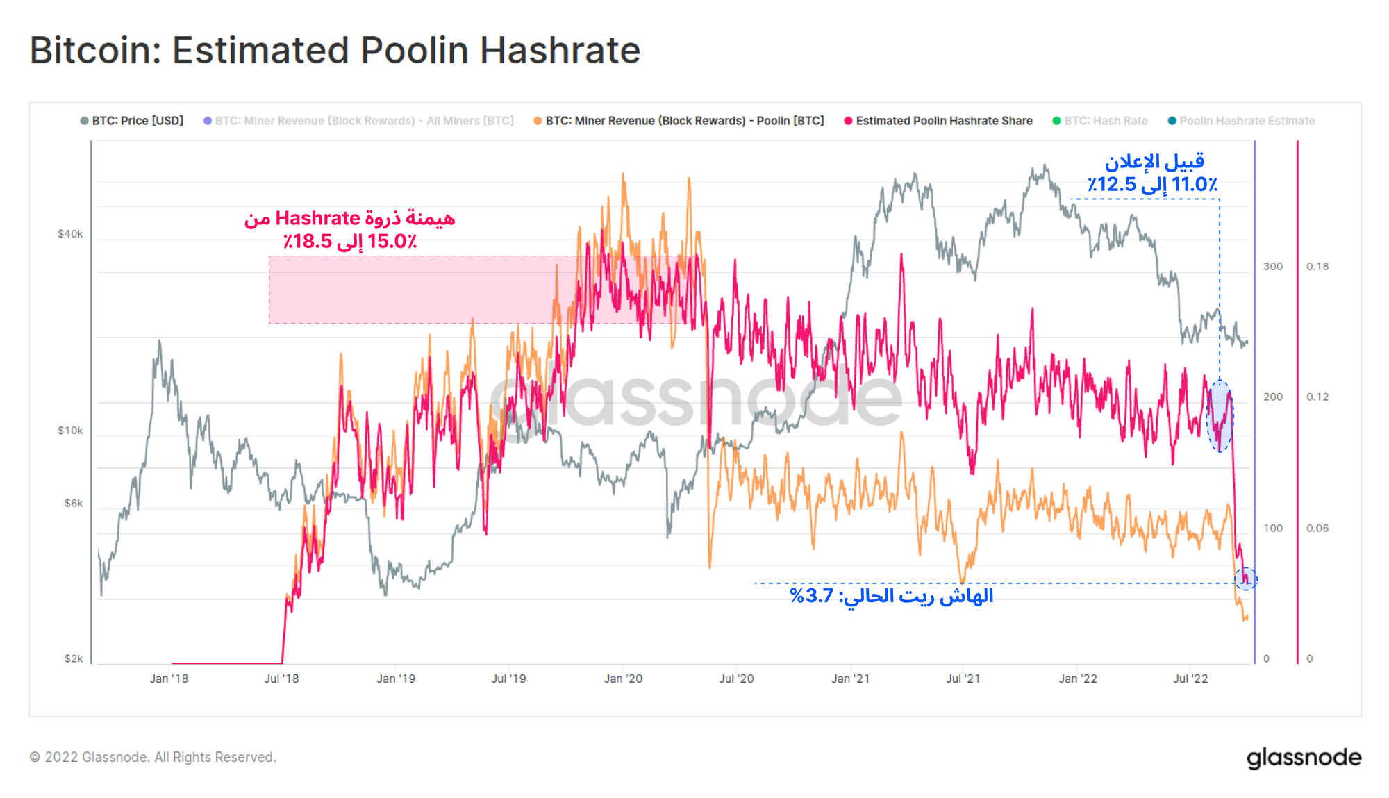 كان Poolin ، حتى وقت قريب جدًا ، أحد أكبر مجمعات التعدين في المجال ، حيث كان يمثل أكثر من 15٪ من معدل التعدين في أوائل عام 2020 ، و 12٪ في بداية سبتمبر. بعد الإعلان عن أن Poolin كان يواجه "مشكلات سيولة" ، انخفض معدل التجزئة الموجه إلى حوض السيولة ، وهو ما يمثل 3.7٪ فقط على الشبكة اليوم.