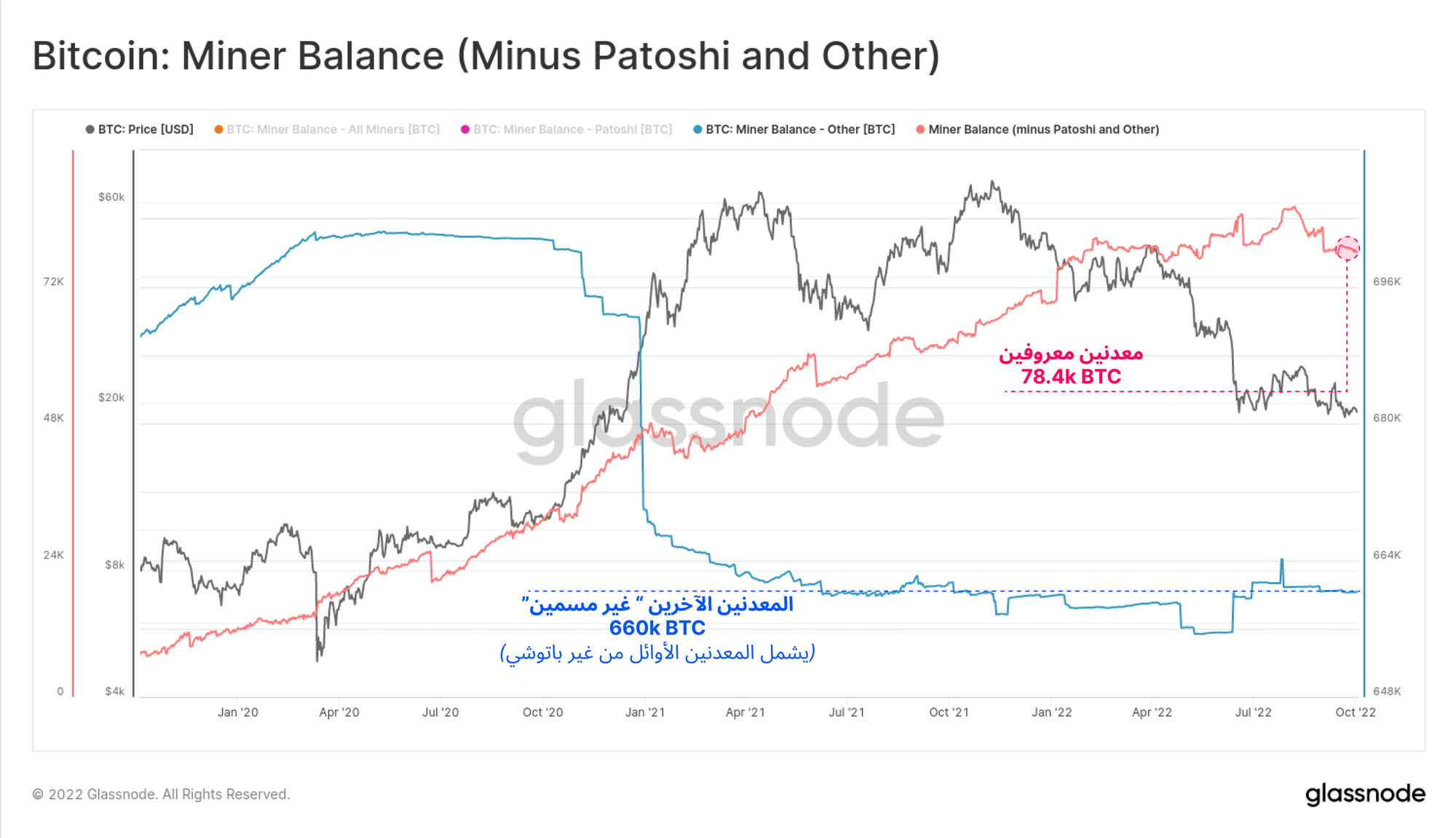 إذا نظرنا إلى الحجم الإجمالي لرصيد المعدنين ، يمكننا أن نرى أن حوالي 78.4 ألف بيتكوين لا يزال محتفظًا بها من المعدنين الذين حددناهم (يمثلون حوالي 96 ٪ من معدل التجزئة الحالي). المجموعة غير المسماة " الآخرون '' أكبر بكثير بحوالي 660 ألف بيتكوين ، ولكن هذا يشمل العملات المتراكمة (ومن المحتمل أن تكون مفقودة) من معدنين من السنوات الأولى للبيتكوين.