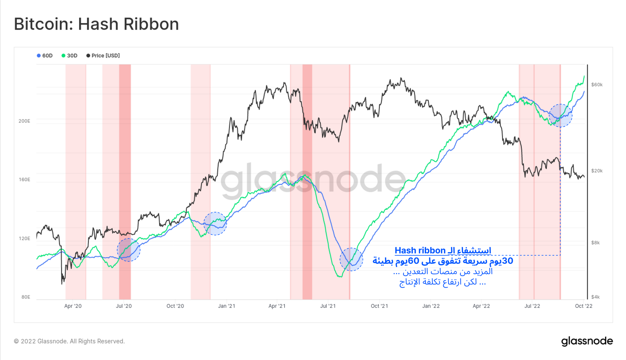 كما هو واضح في اللون الأزرق كان إستسلام المعدنين يستمر لعدة أشهر وبدأ في أواخر شهر مايو الماضي وبدأ التعافي في شهر أغسطس الماضي وكما هو موضح في اللون الوردي إنتهت الأسواق الهابطة السابقة عادة يكون بسبب حدث دراماتيكي مع إنخفاض حاد وسريع في معدل التعدين .