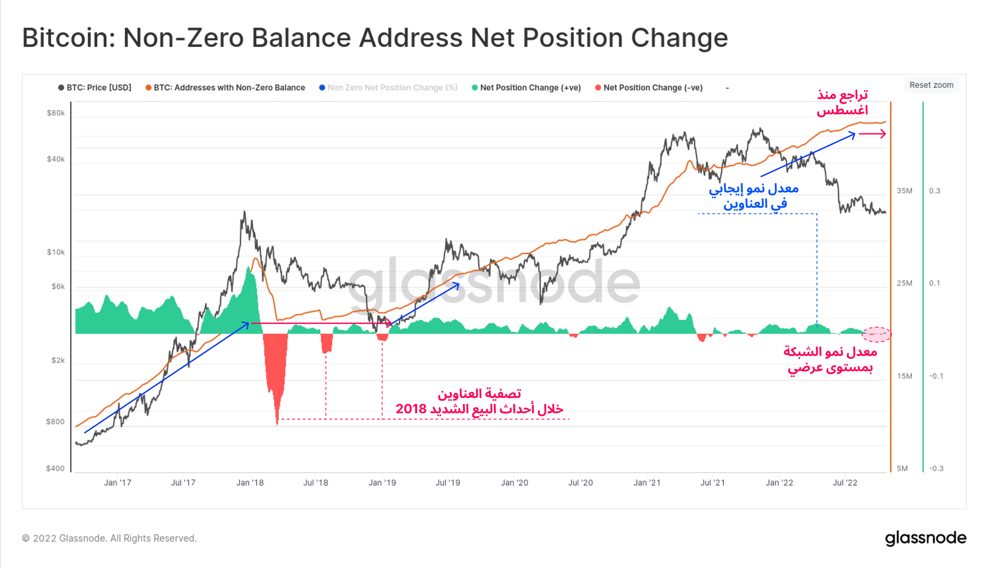 شهد نمو العنواين ذات الرصيد الغير الصفري ركود منذ شهر أغسطس الماضي وهو ما يشبه فترة نوفمبر 2019 ولكن علي الرغم من وجود 400 ألف عنوان " محفظة " جديدة يوميا إلا أنه يتم تفريغ الرصيد بشكل دائم .