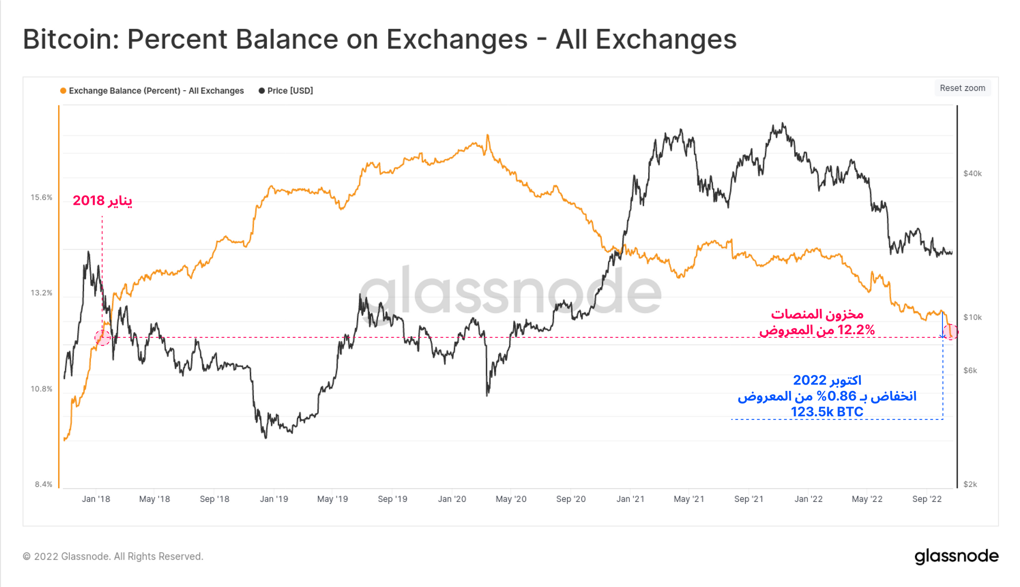 كما واصلت الاحتياطيات المحتفظ بها (البتكوين المخزون) في جميع المنصات انخفاضها المستمر ، حيث انخفضت إلى أدنى مستوياتها في عدة سنوات طوال شهر أكتوبر ، وعادت إلى مستويات يناير 2018. و تم الآن سحب جميع أحجام العملات التي تدفقت إلى المنصات منذ آخر بول ماركت ، إلى محفظات غير مرتبطة بالمنصات (محفظات خارجية).