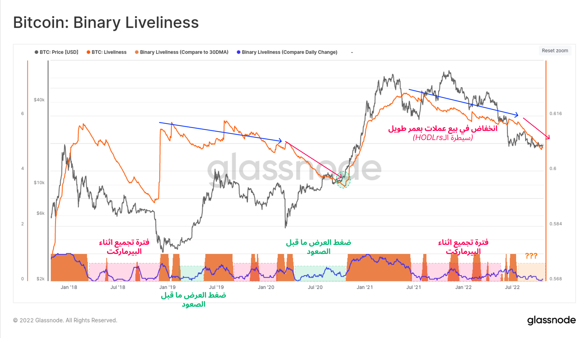 يتم التحقق من صحة ذلك من خلال مؤشر Binary Liveliness ( لقياس حركة تصريف البيتكوين ذا العمر الطويل) ، حيث يمكننا رسم ملاحظتين رئيسيتين منه: