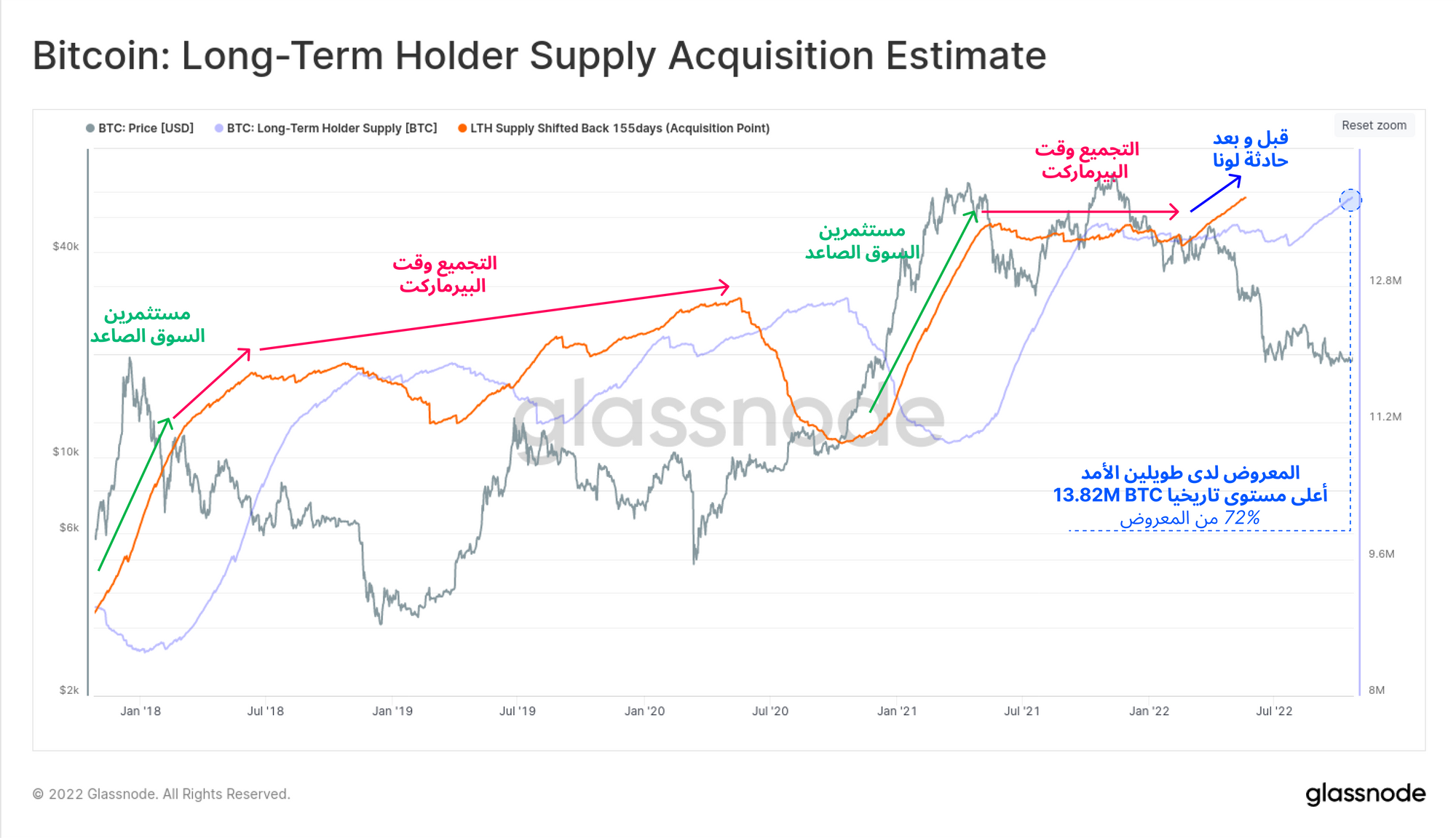 عند فحص منحنى 🟠 الأخير ، يمكننا أن نرى نمط بيرماركت مشابه جدًا لعام 2018 فيما يتعلق بسلوك الاستحواذ للـ LTH. ومع ذلك، فإن الأكثر أهمية هو المسار الصعودي القوي للغاية طوال انهيار LUNA في مايو 2021.