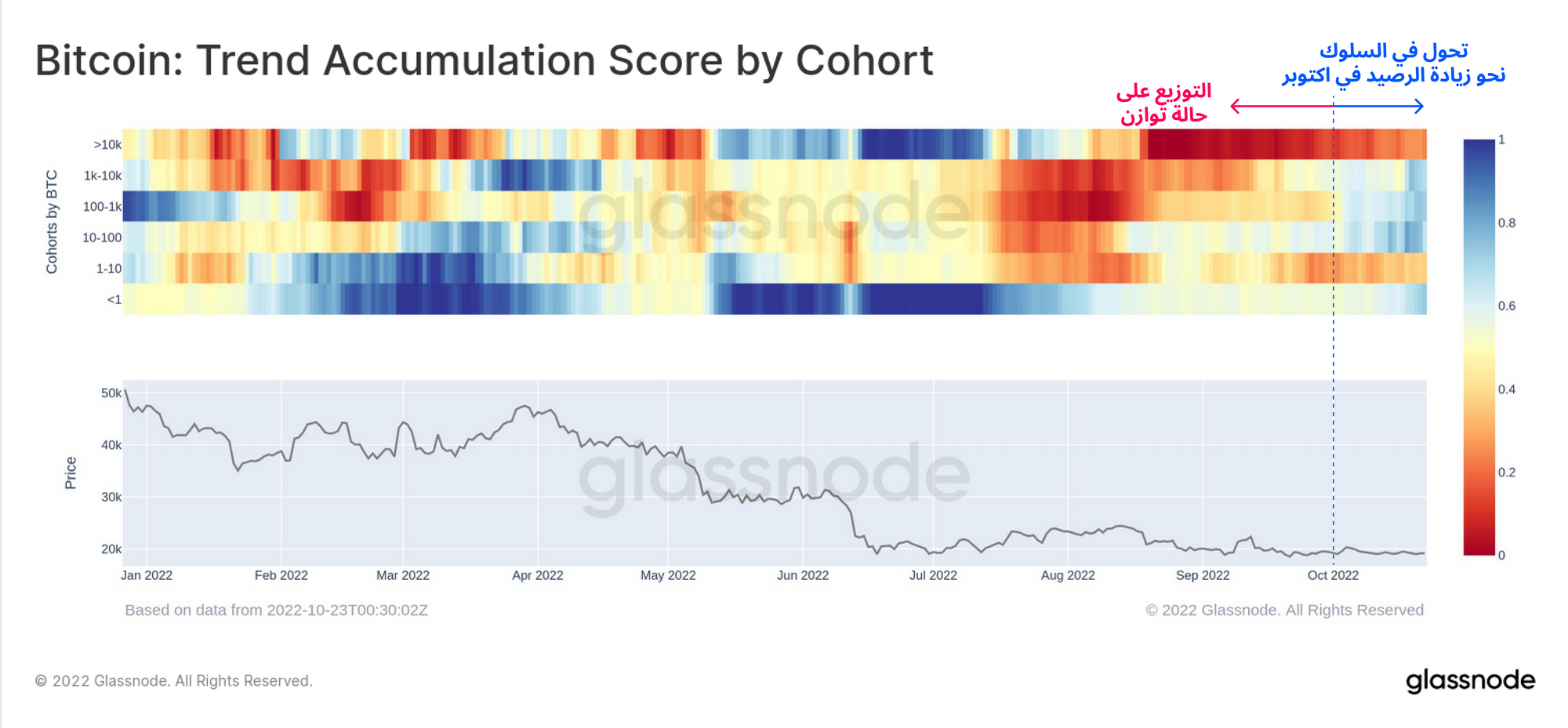 شهد شهر أكتوبر تحولًا ملحوظًا في سلوك تغيير التوازن من قبل معظم المجموعات المختلفة المالكة للبتكوين. لقد تغير سلوك مختلف المجاميع من ضمنهم مالكي المحفظات الصغيرة (اقل من 1BTC) إلى الحيتان (حتى 10 آلاف BTC) حيث تغير سلوك الجميع و ابتعدوا عن خفض الارصدة و البيع 🟥 ، الى التجميع الصافي وزيادة الارصدة 🟦.