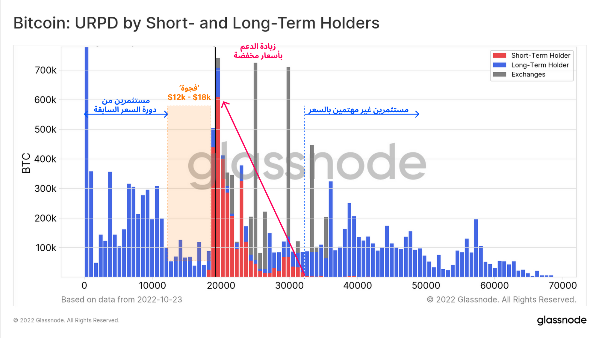 يمكن تصور ذلك في شارت URPD ، مقسمًا إلى المالكين القصيري الامد (STHs ، 🔴) و المالكين الطويلي الامد (LTHs ، 🔵). يمكننا أن نرى أن حجم كمية البتكوين المنتقل إلى مشترين جدد (STHs) يزداد بشكل ملحوظ بأسعار تتراوح بين 18 ألف دولار و 20 ألف دولار ، مما يعزز الملاحظات أعلاه.