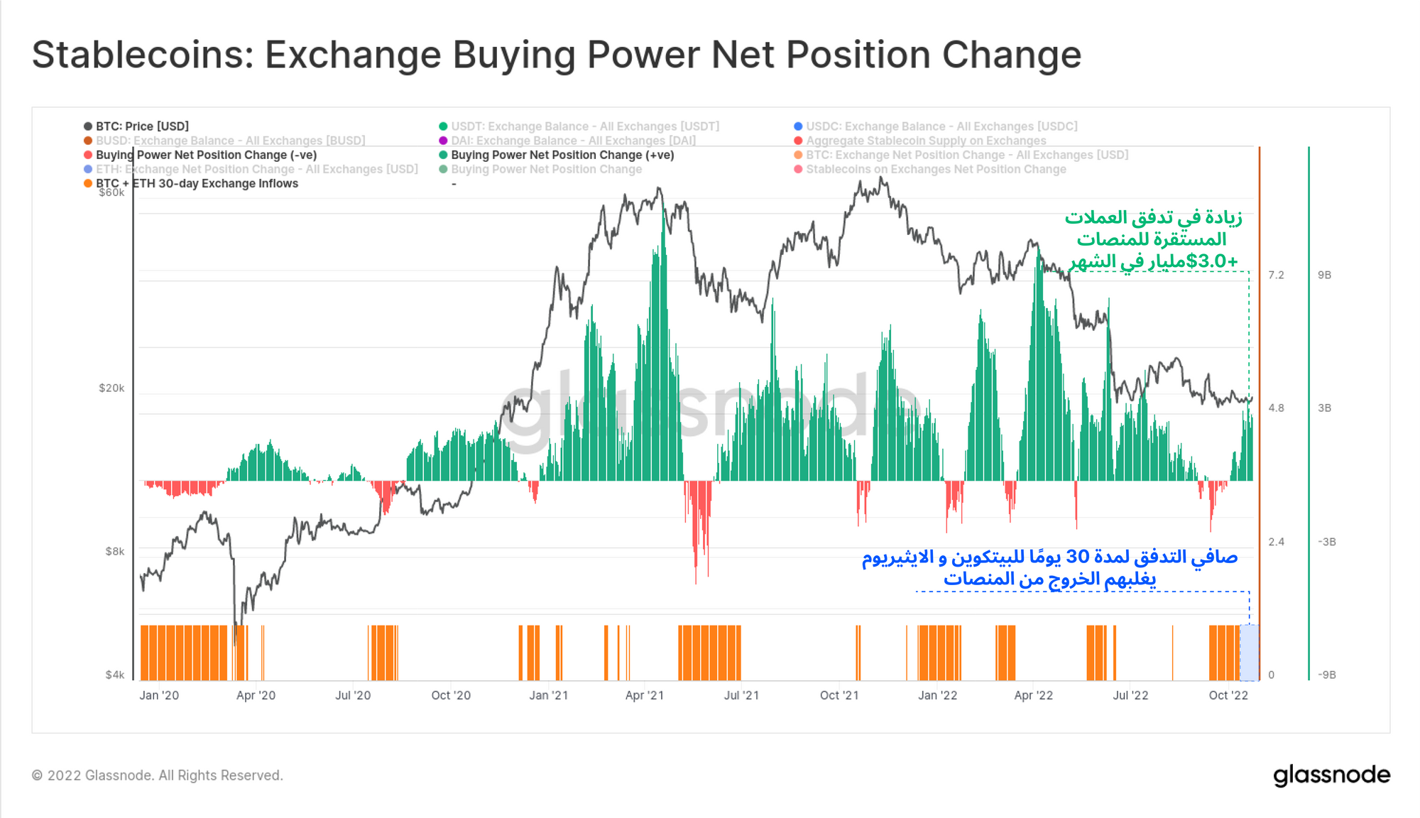 ملاحظة أخرى مرتبطة بالتبادلات هي التوازن بين صافي التدفقات لمدة 30 يومًا للأصول الرئيسية (البيتكوين و الايثيريوم) ، مقارنة بالتدفق الصافي لمدة 30 يومًا لأكبر أربع عملات مستقرة USDT و USDC و BUSD و DAI.