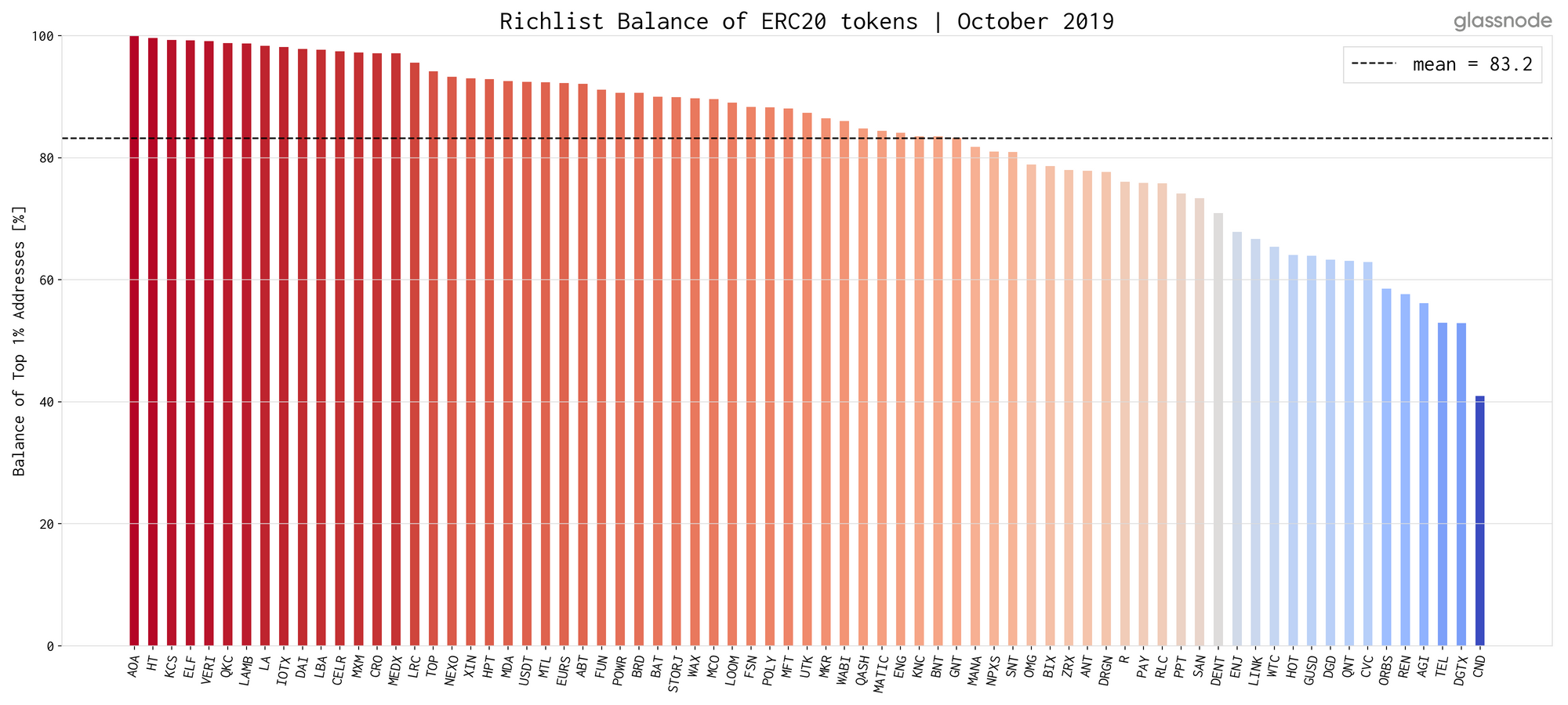 The following chart shows that the richest 1% addresses hold between 41% (CND) and almost 100% (AOA) of externally held funds — with a mean of ~83.2%. These numbers indicate a relative concentration of funds on a small number of addresses.