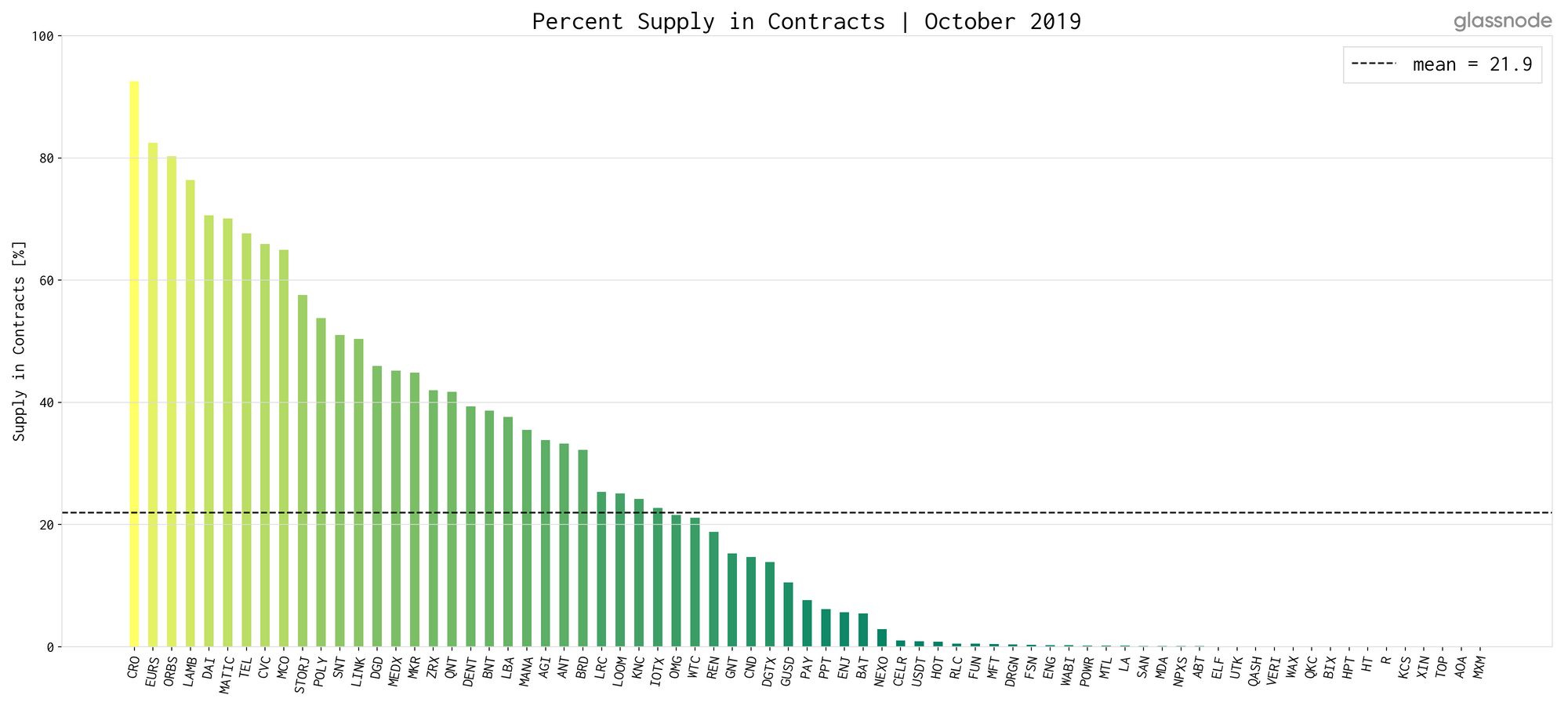 The amount of supply in contracts of the analysed tokens ranges all the way from basically zero, up to 92% for CRO.