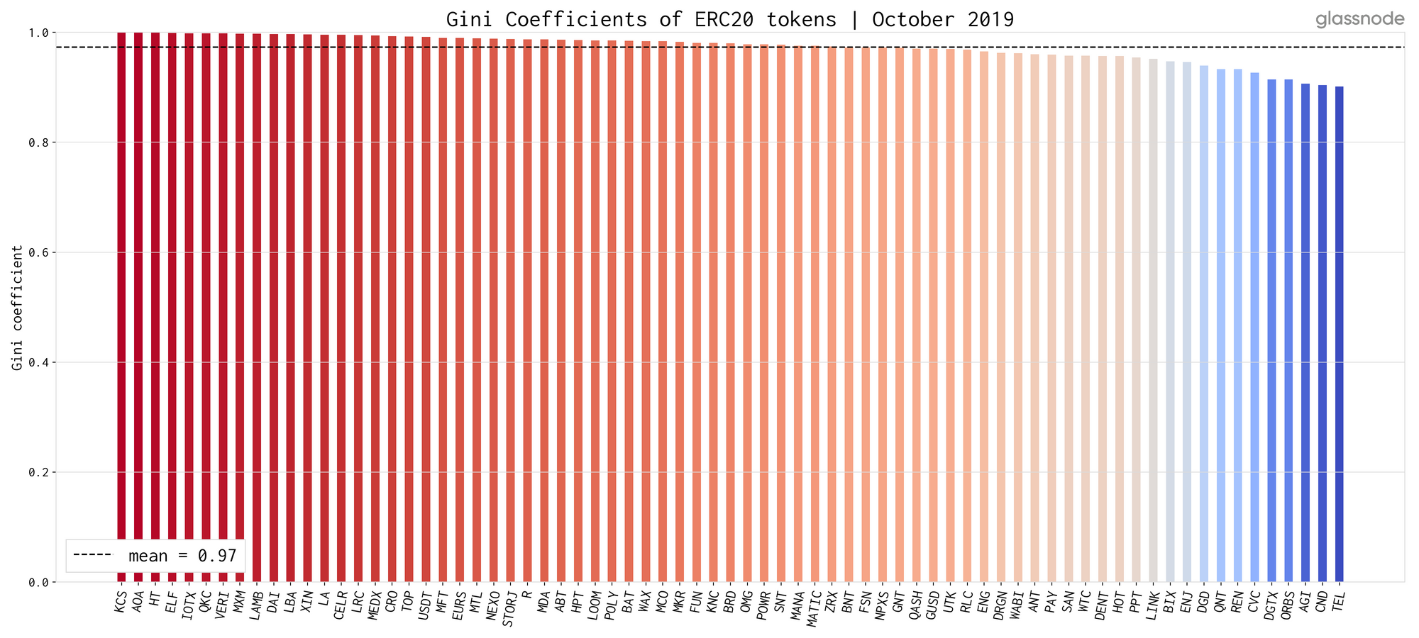 Our analysis shows that, according to Gini, distribution of tokens is highly unequal. The average Gini Coefficient (as of October 2019) across all analysed tokens is 0.97.