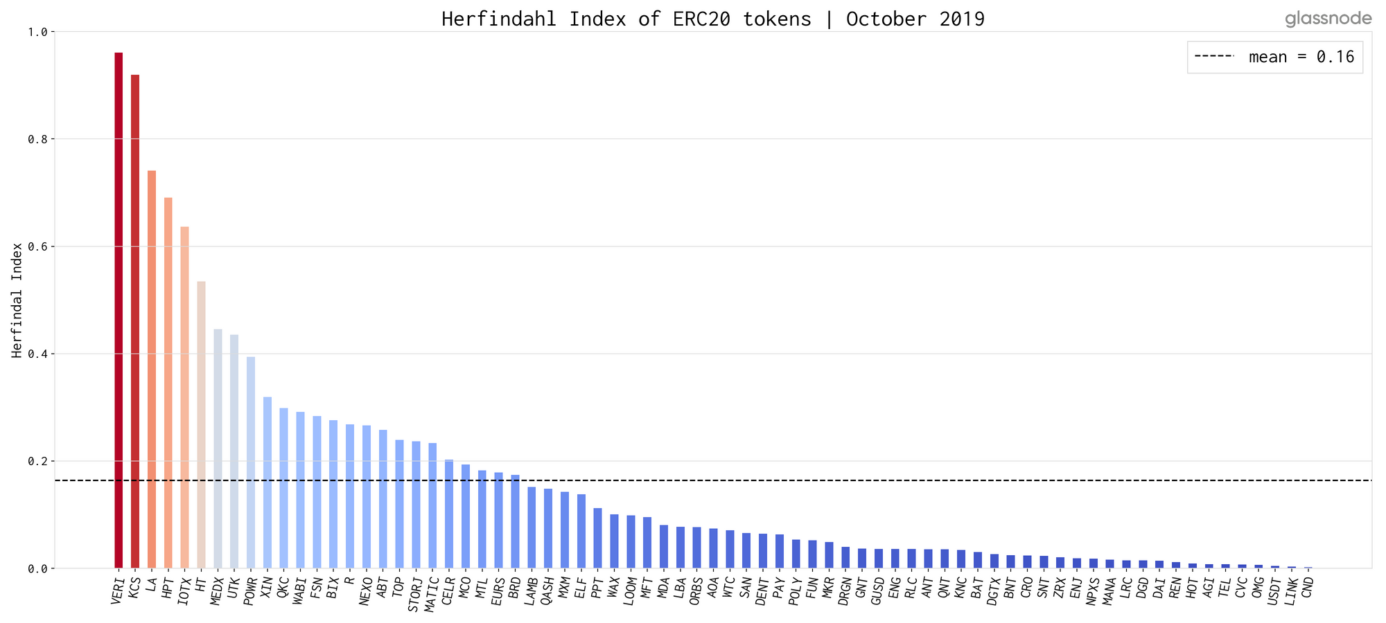 The Herfindahl Index ranges between 0 and 1: A large score indicates high concentration of supply, whereas a small score is an indicator for more evenly distributed funds across addresses. In particular, the Herfindahl Index is useful for the identification of tokens in which a single addresses/entities owns a predominant amount of the token.