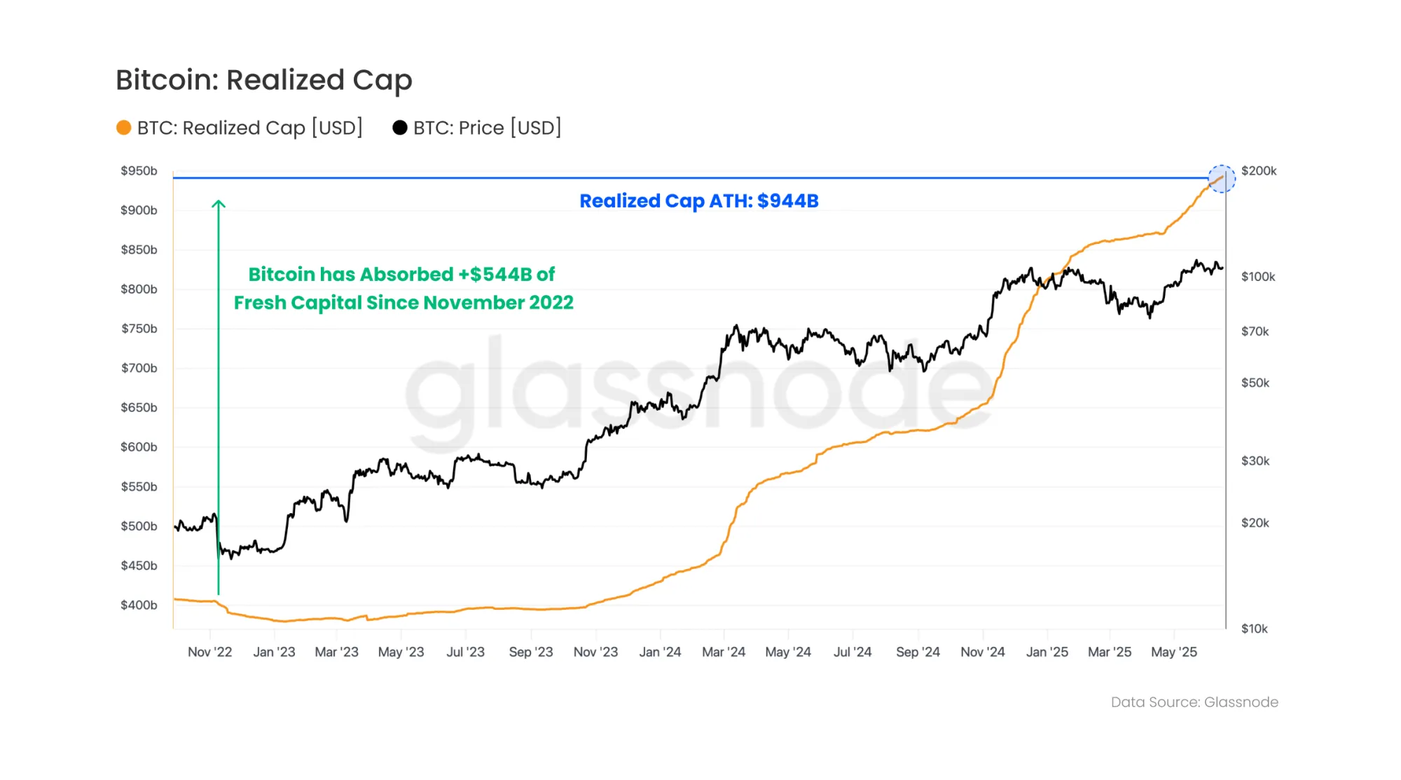 Realized Cap has surged by over $544B since November 2022, pushing Bitcoin’s network liquidity to an all-time high of $944B. As institutional and sovereign adoption accelerate, on-chain data shows that Bitcoin’s role in the global financial system is expanding - mirroring broader macro liquidity trends.