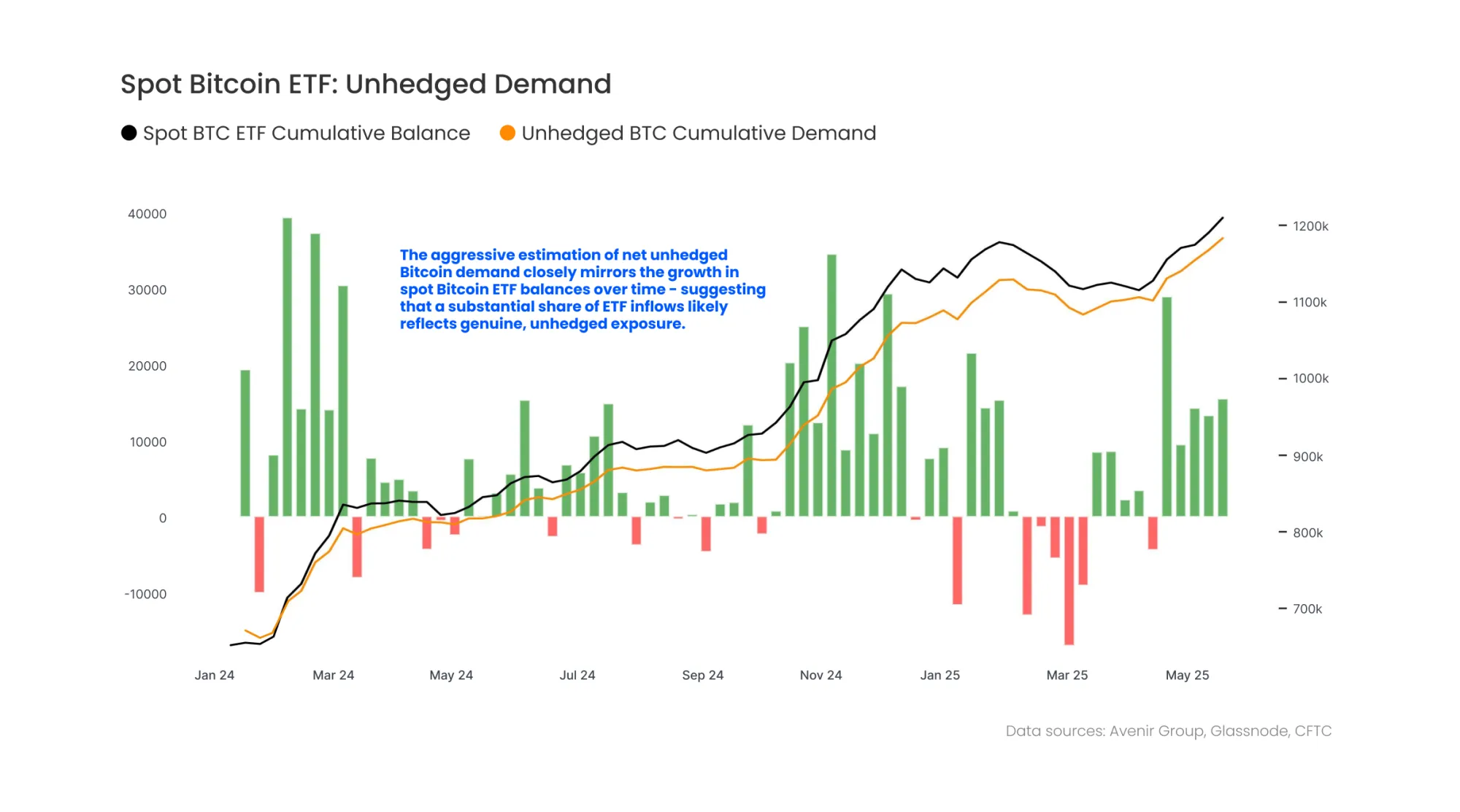 One of the most significant findings in the report is that the majority of inflows into U.S.-listed spot Bitcoin ETFs appear to be unhedged. This suggests that institutional allocators are using these vehicles not for arbitrage or basis trading - but to express directional, long-only exposure. As a result, ETF flows may exert a more lasting effect on price formation than initially assumed.