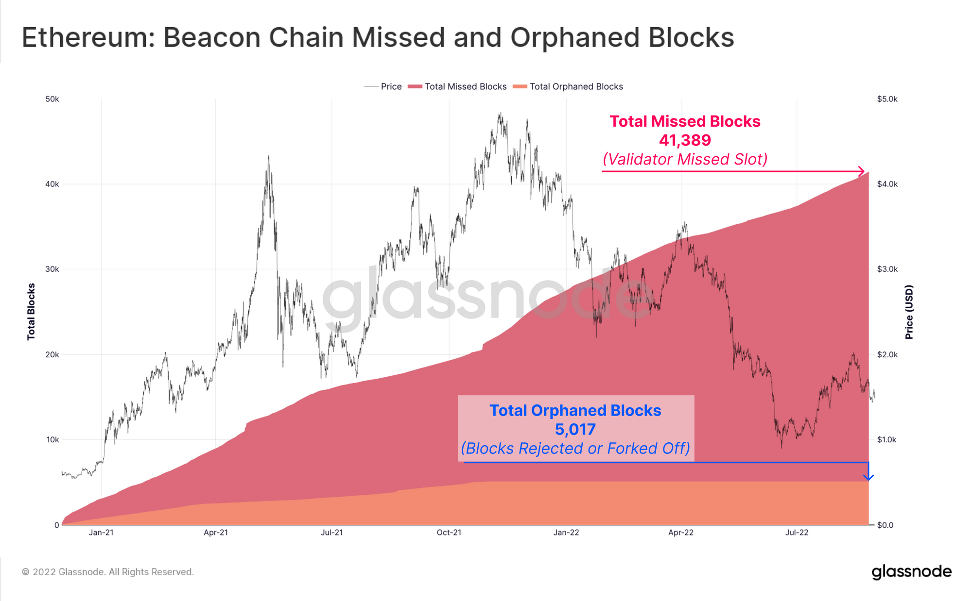 There are other instances where a block is rejected by the attesting validators, or results in a naturally occurring fork. These blocks are called orphans, and represent an alternative version of block-history which was not followed by the majority of the network. Just 5,017 orphan blocks have been produced on the Beacon Chain so far, accounting for just 0.110% of slots.