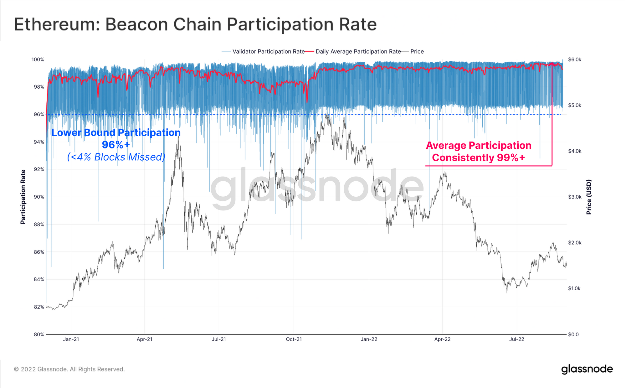 The blue curve below shows the measured participation rate for each epoch, and can be seen to be generally higher than 96%. The red curve then shows the daily average, which has consistently hit 99%+ participation, particularly since the market price ATH in November 2021. This demonstrates that so far, validators on the Beacon Chain are consistently online and producing blocks when allocated a slot.
