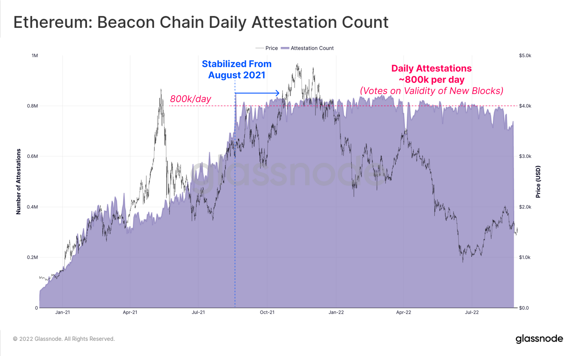 With an average slot interval of 12 seconds, and 127 attesting validators, we should expect a stable daily attestation count of between 783k and 914k attestations per day. Indeed, since August 2021, the total daily attestations has stabilised within this range, with around ~800k attestation votes per day.
