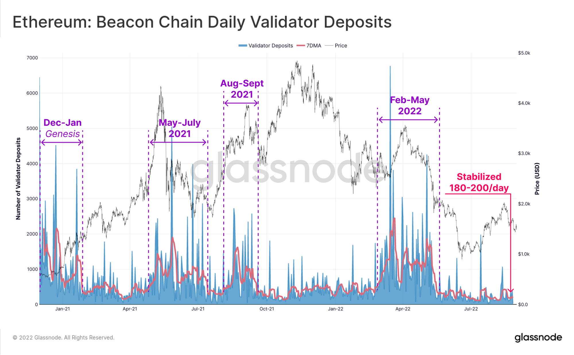Over the last 639-days, ETH deposits have continued to flow into the Beacon Chain contract, as development progressed, staking infrastructure increased, and community confidence grew. A stable baseline of around 200 to 250 deposits per day has been observed since the genesis block.