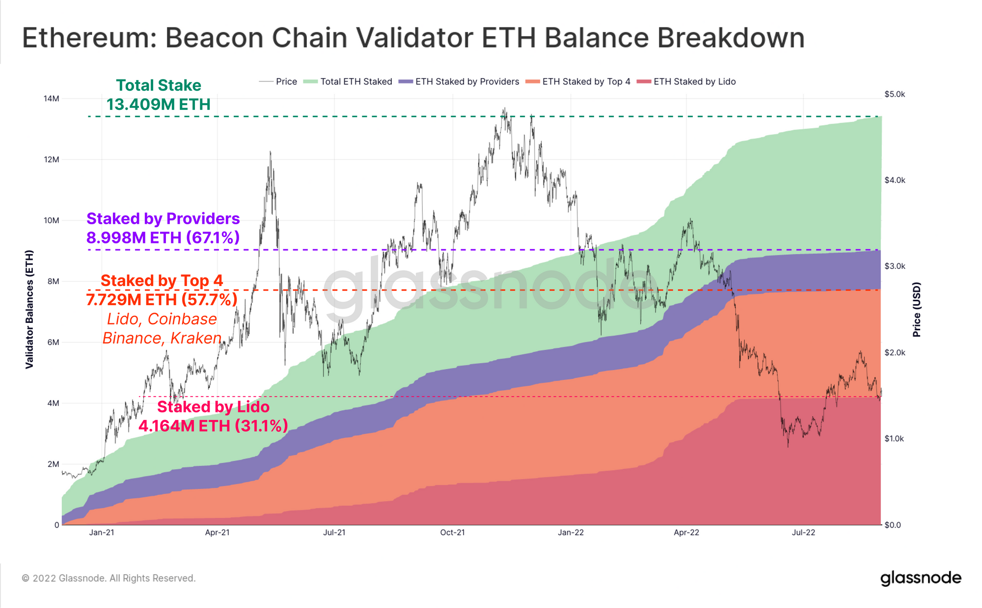 - Lido (red) is the largest entity in the staking network, operating validators which account for over 4.164M ETH, and represent 31.1% of the validator pool.