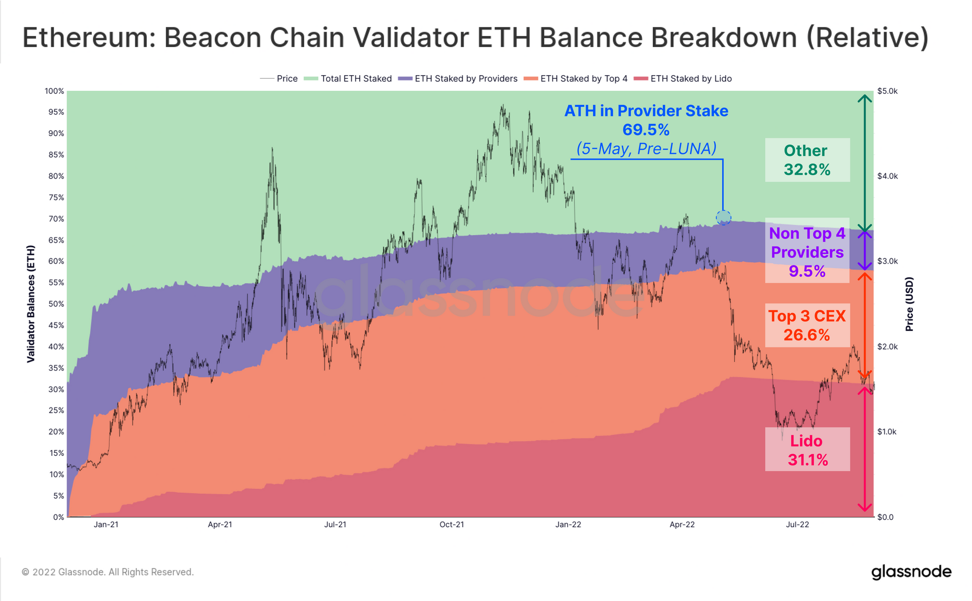 Interestingly, the 'Solo Staker and Unknown' cohort (green) have increased their dominance slightly, seemingly following the collapse of LUNA-UST. Staking provider dominance peaked at 69.5%, and has since declined to 67.2%.