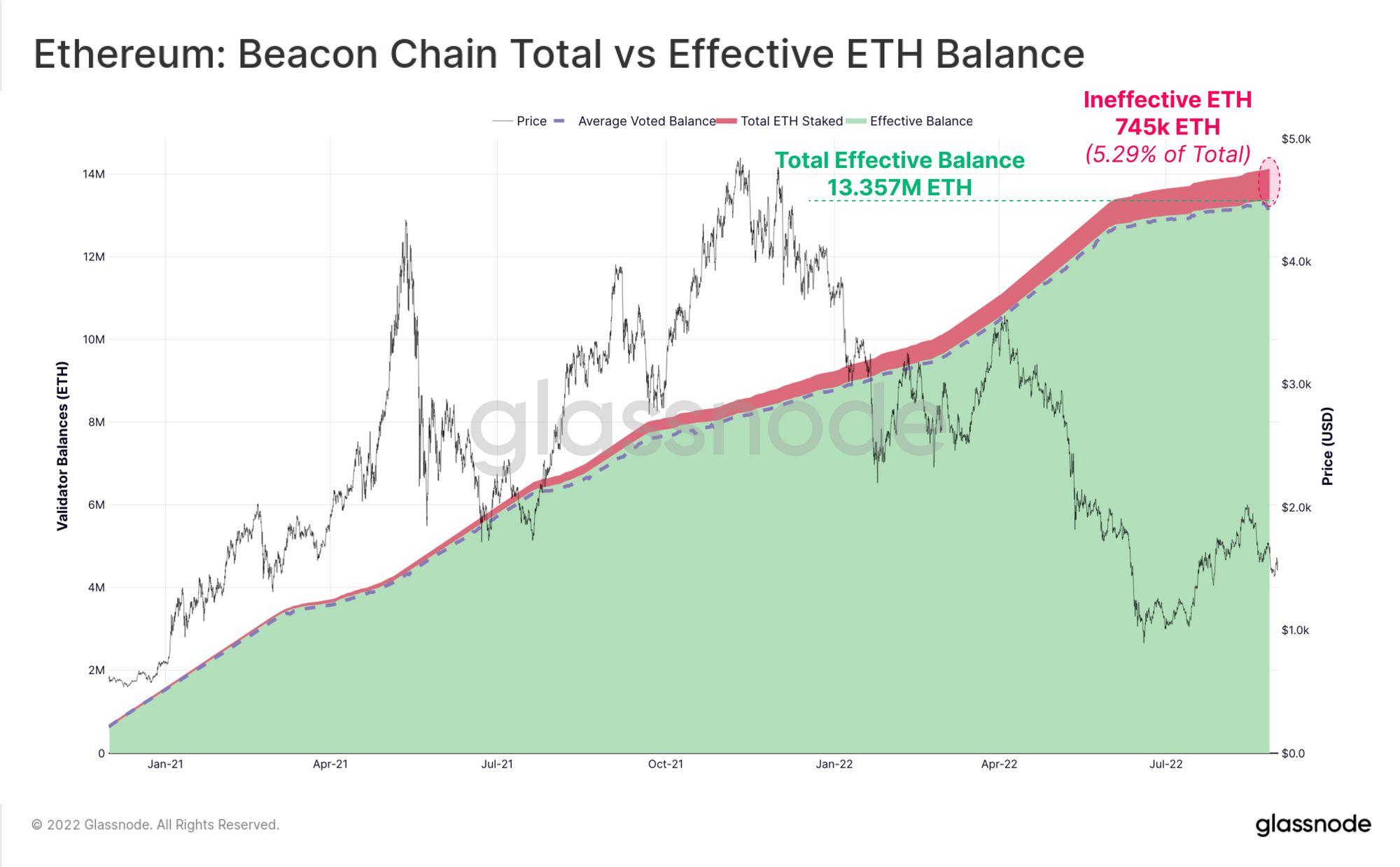 The chart below shows the aggregate Effective Balance (green) which is actively participating in PoS consensus. The remaining Total Balance (red) is essentially excess ETH which may be considered a buffer of inactive stake. At the moment, the total effective balance is 13.357M ETH, and around 745k ETH is inactive (5.29% of total).