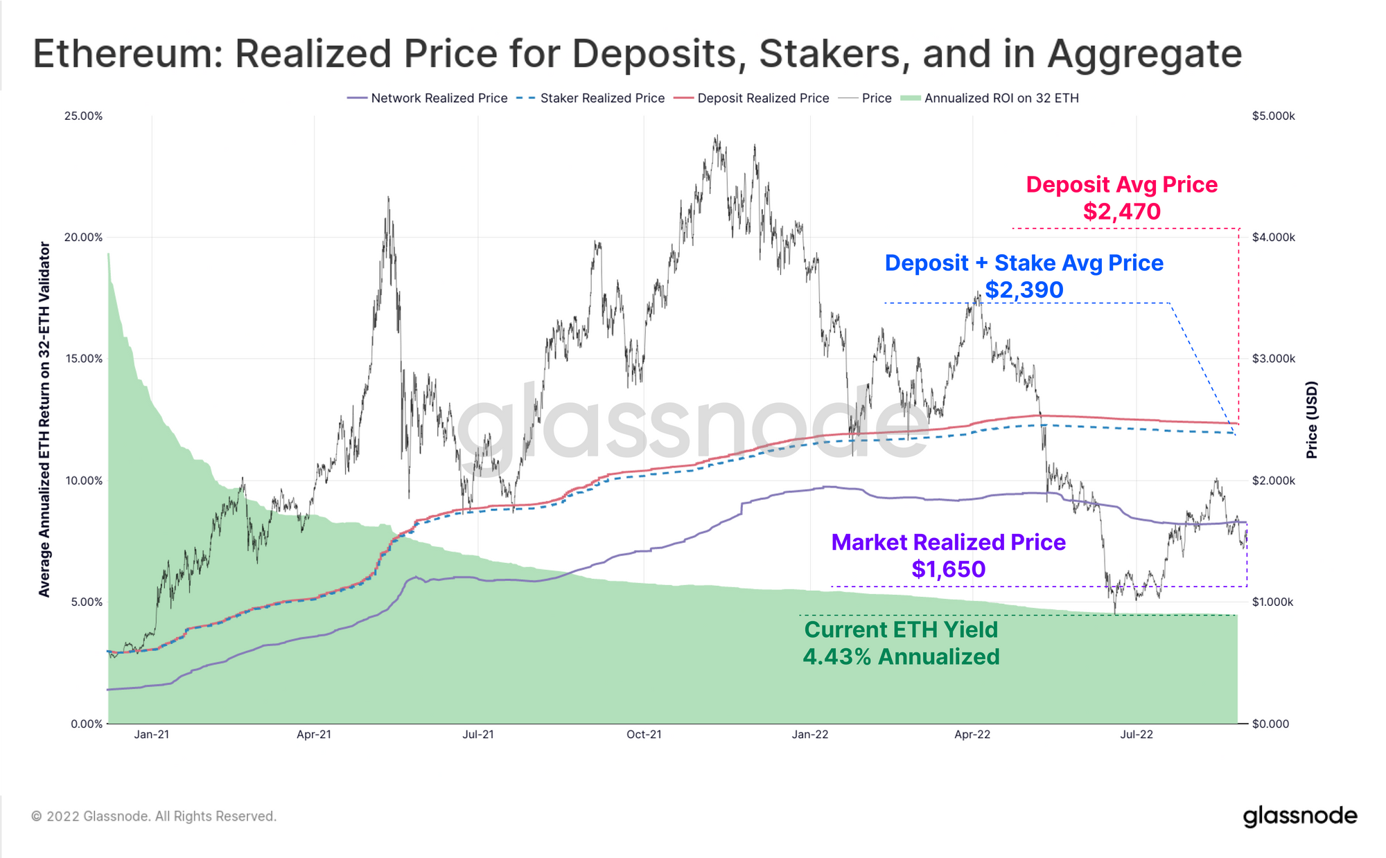 - Realized Price for all Beacon Chain deposits (red) is $2,470, which is 50% higher than the average for the market. This means that staked coins are holding an unrealized loss which is 33% larger than the average ETH investor.