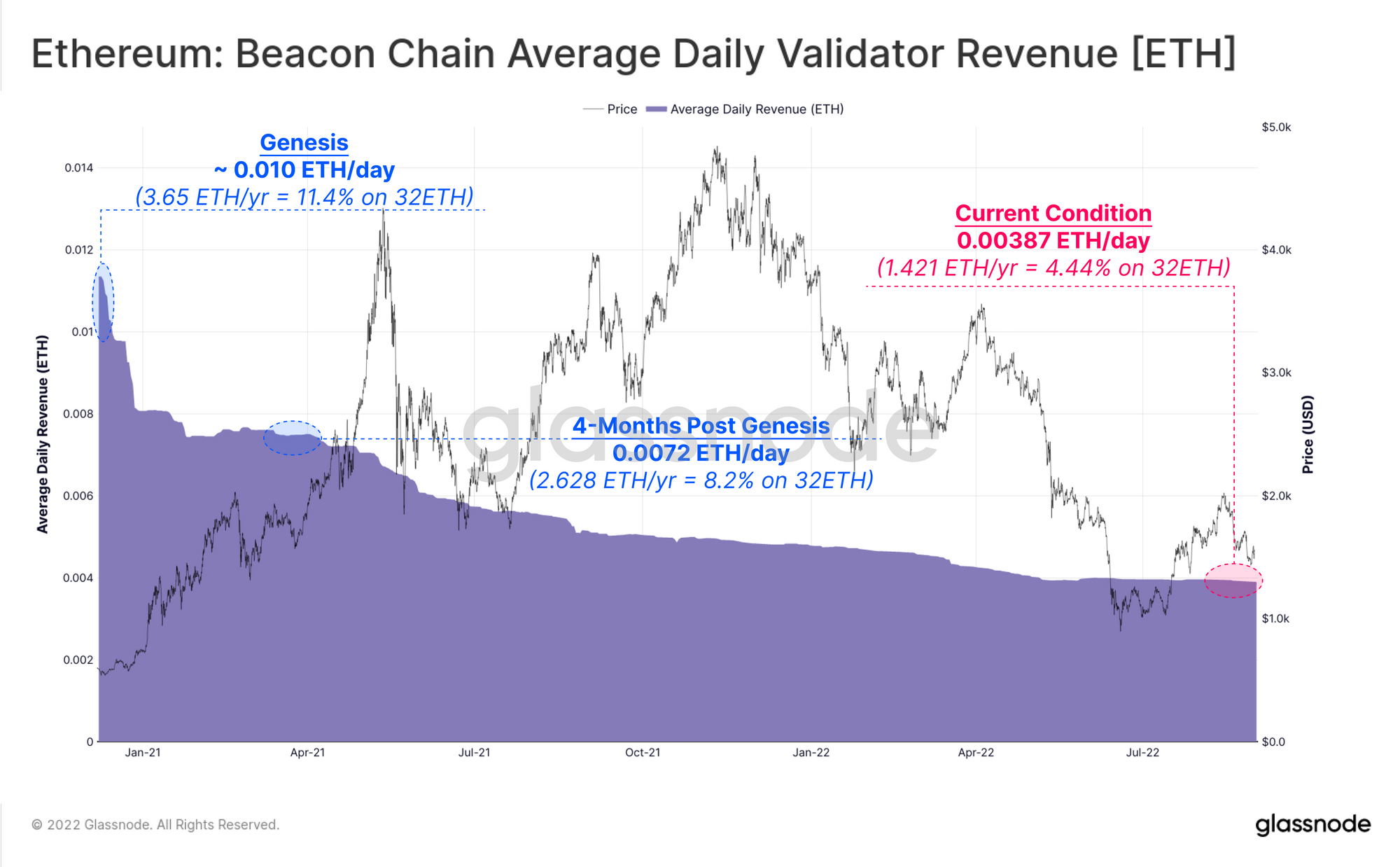 This has played out so far, with the annualized average ETH revenue declining from 3.65 ETH/yr at genesis, to 1.42 ETH/yr today. Considering the deposit contract is essentially one way (and very few validators have left the pool), this reward dilution is almost entirely a result of the increasing volume of staked ETH over the last 18-months.