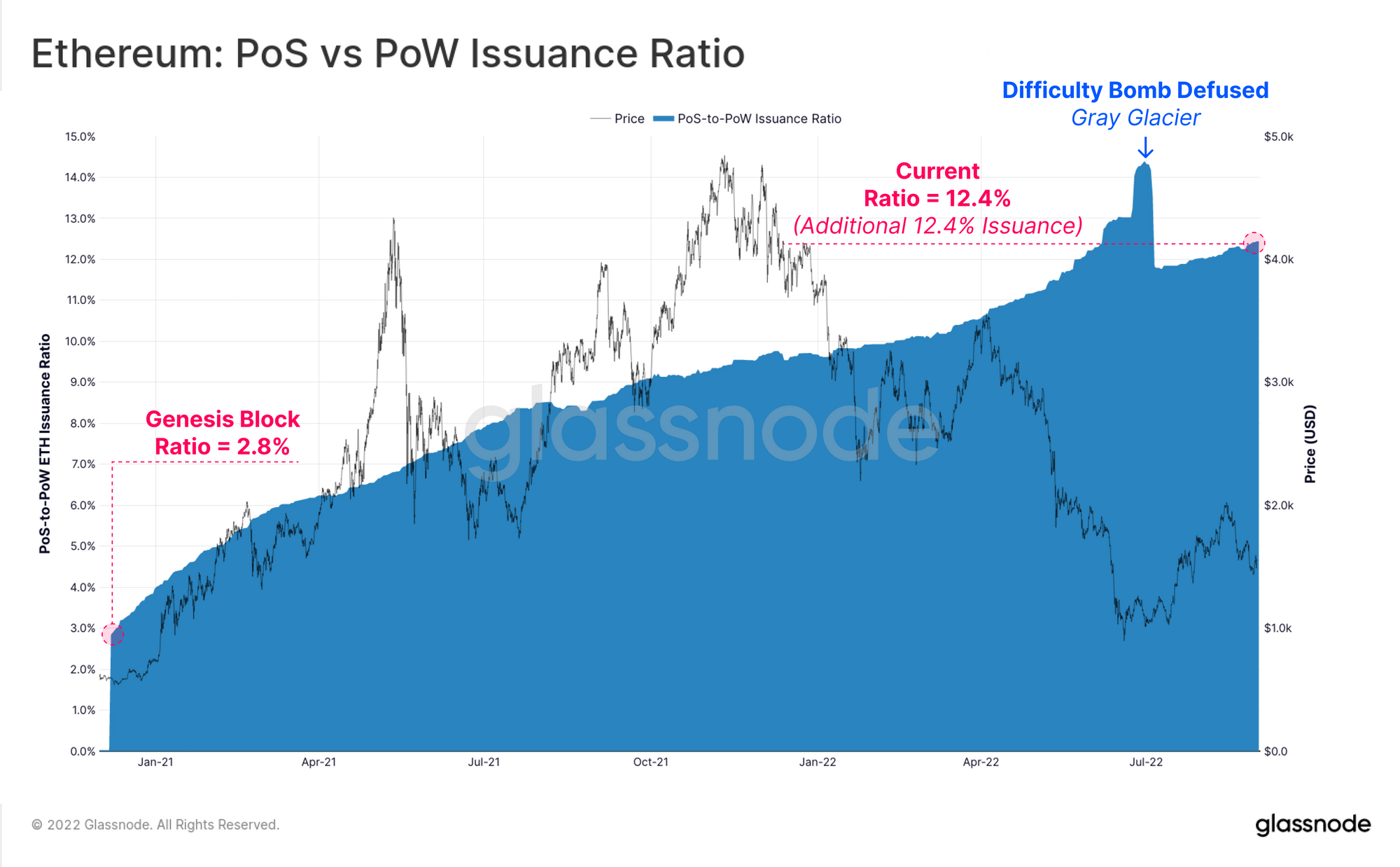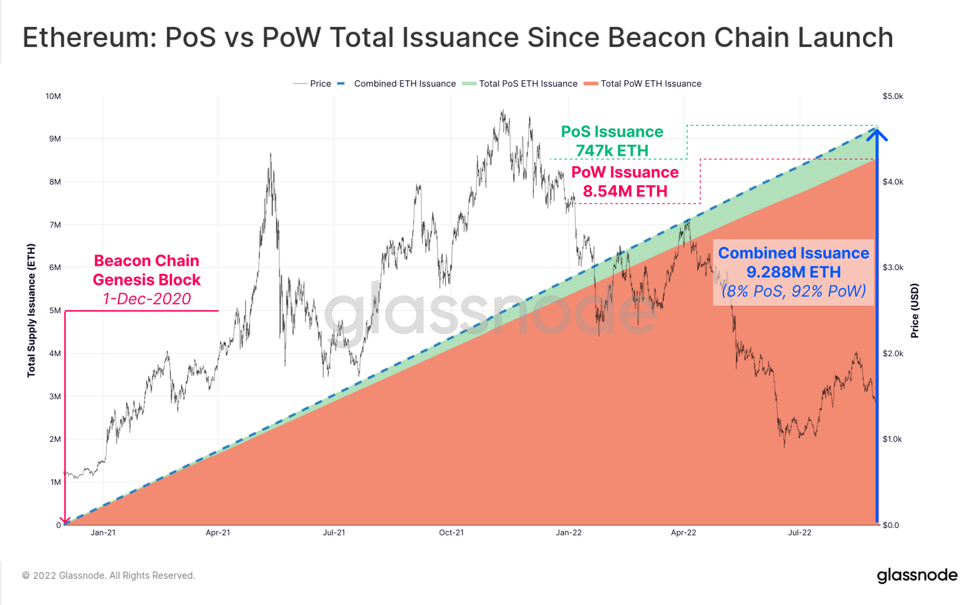 With both the PoS Beacon Chain, and the existing PoW Etheruem chains operational, the total issuance of ETH currently has two sources. Since the Beacon Chain genesis block, a total of 747k ETH has been issued on the PoS chain, and 8.54M ETH on the PoW chain. This equates to an issuance split of approximately 8% PoS vs 92% PoW.
