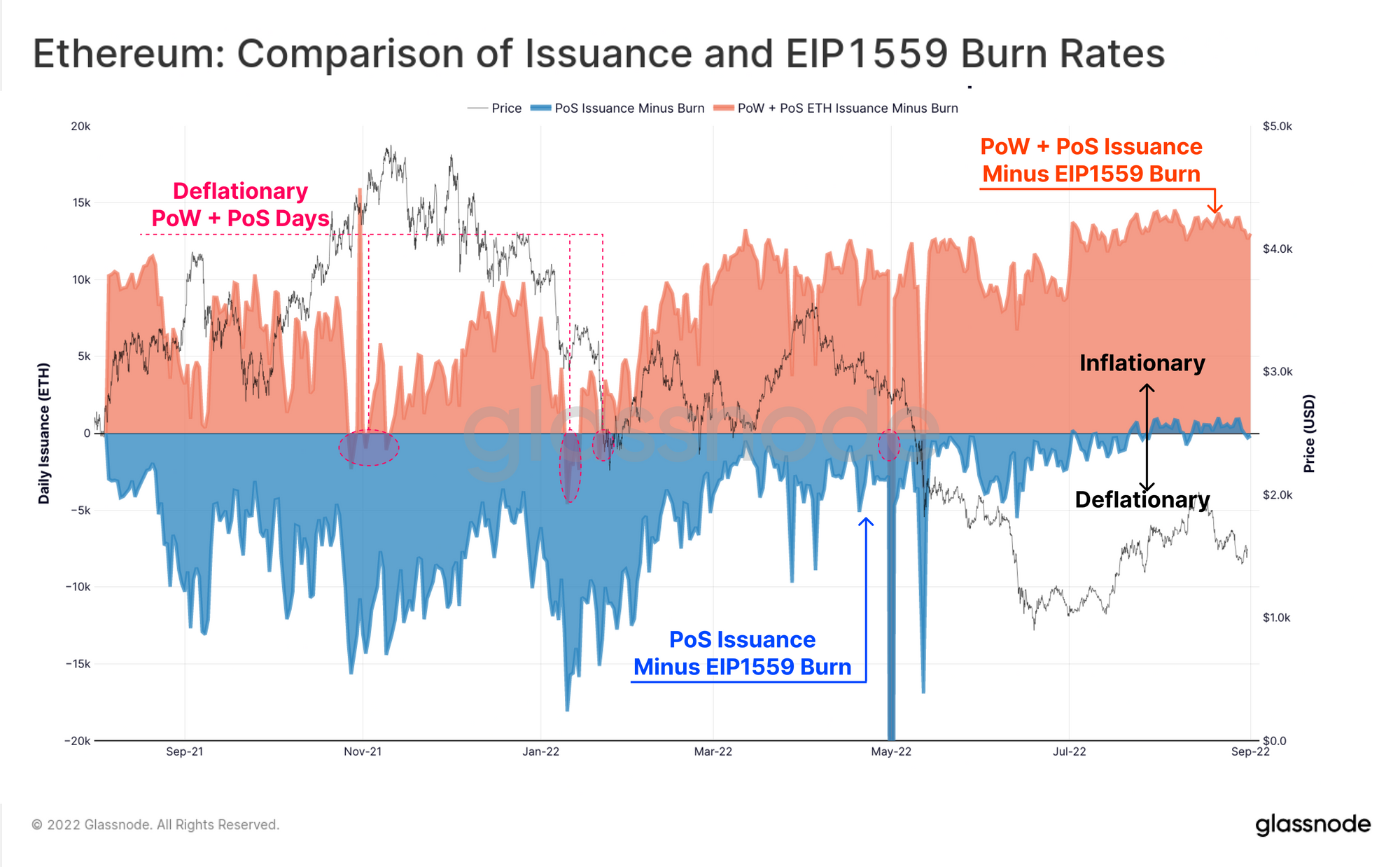 - Simulated condition (blue), with only the PoS Beacon Chain active, and with EIP1559 live on the PoS chain. This simulates what the market may have been like if the Merge was shipped with EIP1559, and it shows a clear net deflationary system until late-July 2022 where issuance stabilises around +500 to +1,000 ETH/day.