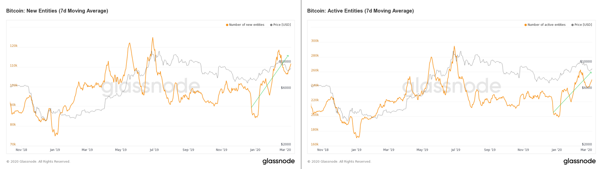 At the same time, the number of new entities and active entities in the Bitcoin network have been on a general upward trajectory since January, reaching levels of activity not seen since the lead-up to the $12k price spike June/July last year.