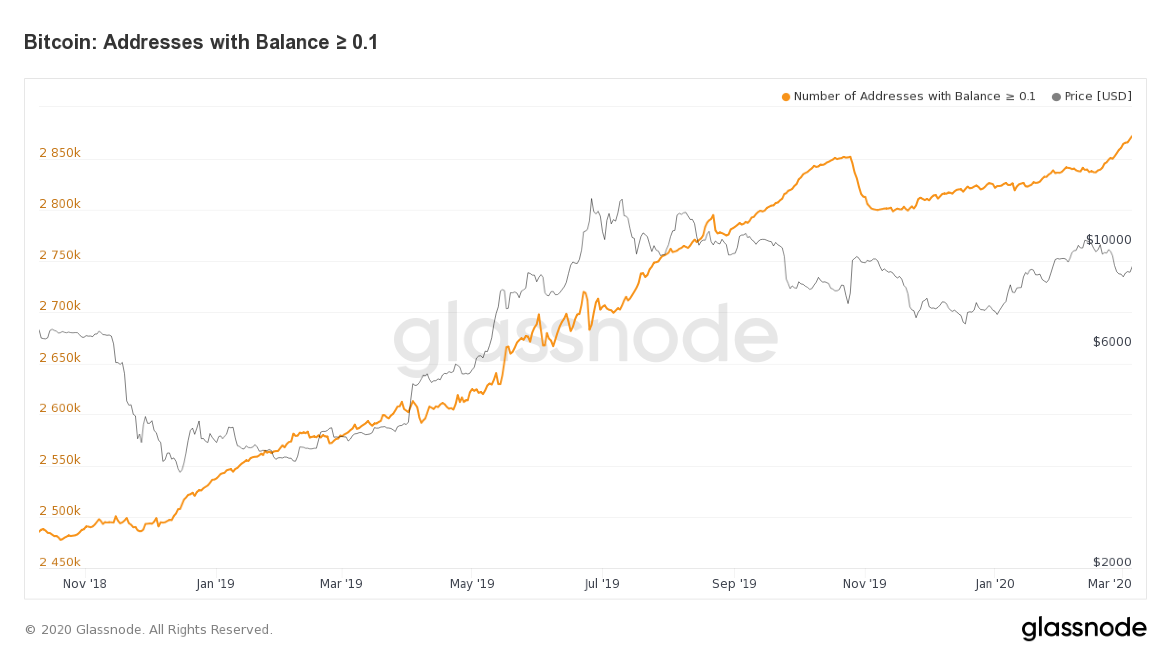 2,973,761 unique Bitcoin addresses now hold at least 0.1 BTC. Having experienced large spikes in early 2016 and again in late 2017, the recent increase in this metric sets an optimistic tone for bitcoin adoption, especially by retail investors.