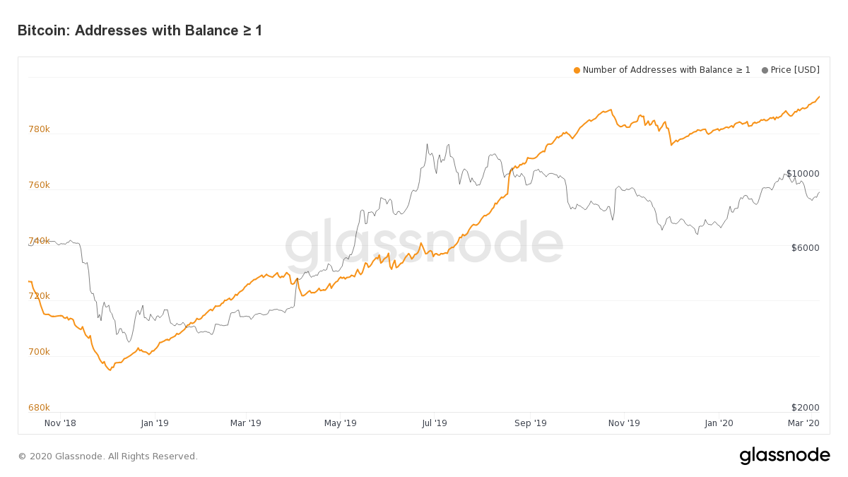 Since mid-February, the growth rate of this metric has increased, moving more sharply upwards. This coincides with the number of addresses with >1 BTC experiencing increased growth over the past month, suggesting more widespread awareness and adoption.