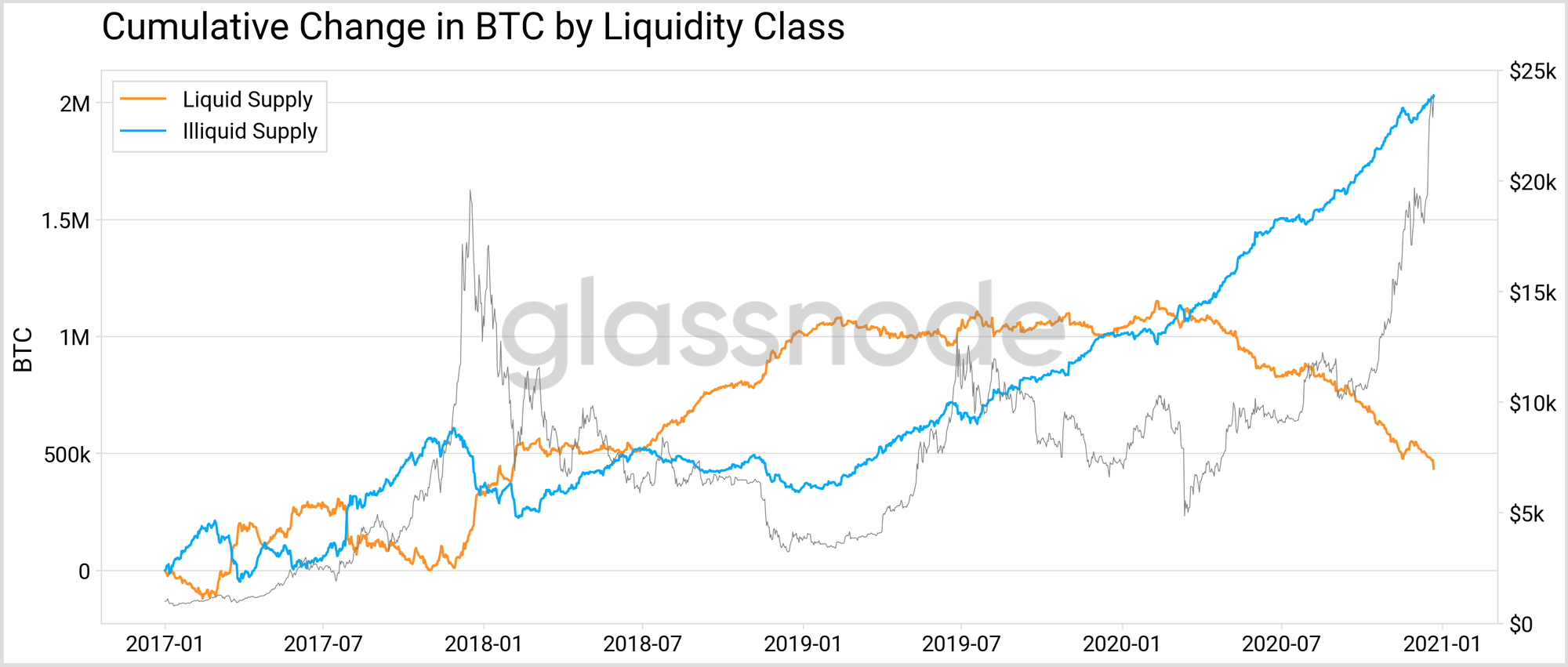 Quantifying the amount of liquid and illiquid BTC supply and its relationship to Bitcoin's price.