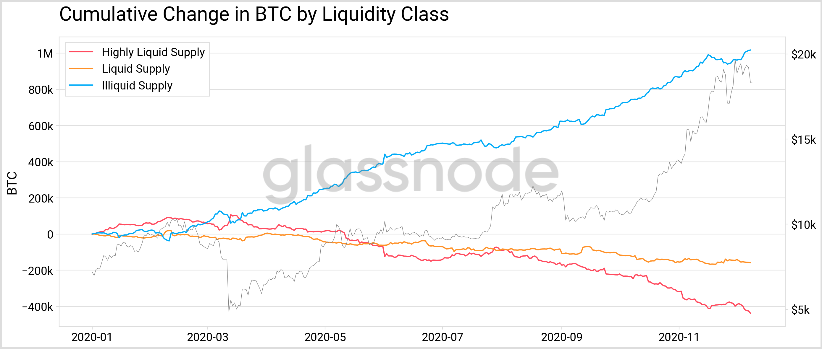 It's worth looking at how this trend has evolved in the past. Looking at the change of supply in each categoy from the beginning of the year, we can see a clear upwards trend of Bitcoin illiquidity. This is indicates that the present bull market is driven by the staggering amount of illiquidity.