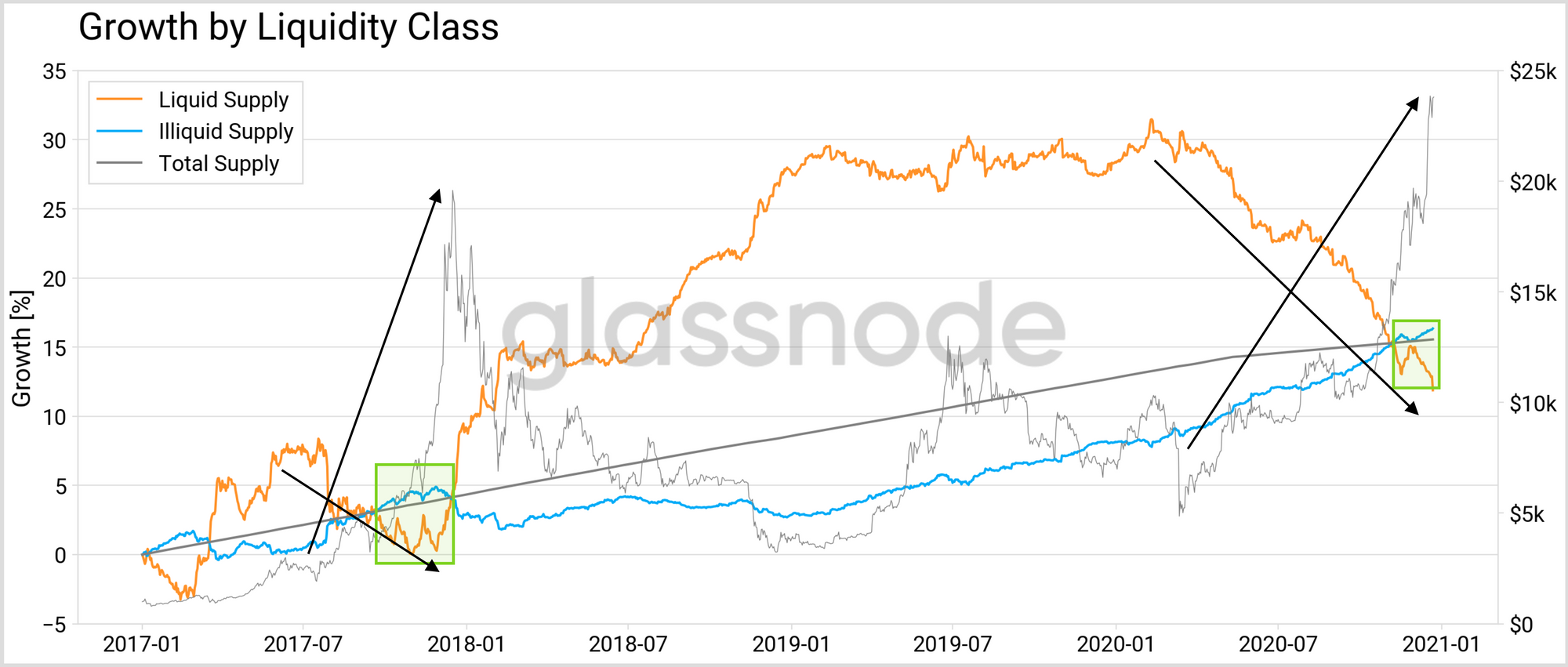 Currently we are at a stage in which the illiquid supply is growing more than the total circulating supply. An pattern we have similarly observed during the bull run of 2017.