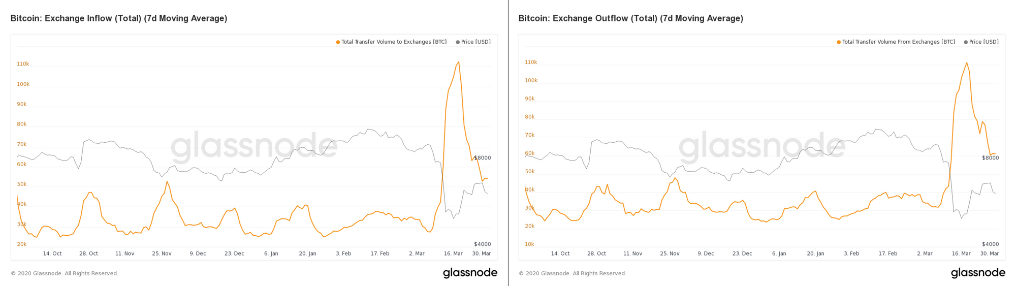 While the total volume of exchange inflow (in BTC terms) is lower than the total outflow, it is still at relatively high levels when compared to longer-term historical data.