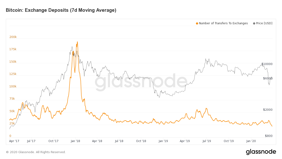 However, unlike deposit volume, the total number of daily deposits to exchanges is at its lowest level in the past 3 years. The number of daily BTC deposits to exchanges hasn't been this low since September 2016, 3 and a half years ago.