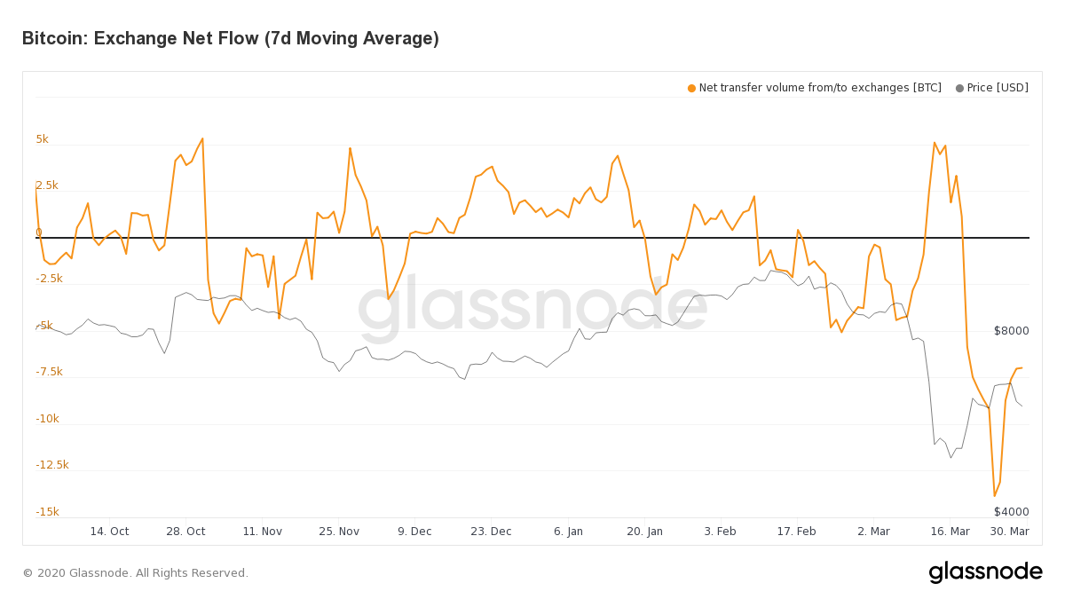 Bitcoin's exchange net flow shows that BTC has been leaving exchanges following the recent price dip.