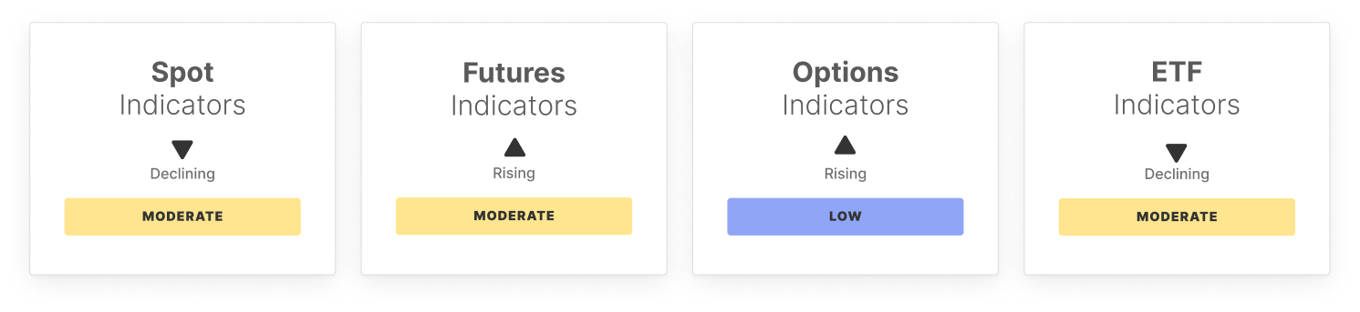 Spot market conditions remain fragile. Trading volume has rebounded modestly from cycle lows, pointing to early signs of liquidity rebuilding, however spot CVD has deteriorated, signalling rising sell-side dominance and a more defensive near-term posture. Derivatives positioning is mixed. Futures open interest has edged higher, reflecting a mild rebuild in speculative engagement, while long-side funding has risen sharply, signalling renewed willingness to pay for bullish exposure. In contrast, perpetual CVD has flipped deeply negative, highlighting elevated sell-side aggression across leveraged markets.