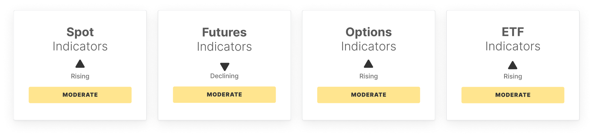 Options markets show heightened engagement, with open interest climbing above its extremes and volatility spread surging, reflecting increased hedging and speculative activity. Meanwhile, 25-delta skew remains positive, pointing to sustained demand for downside protection.