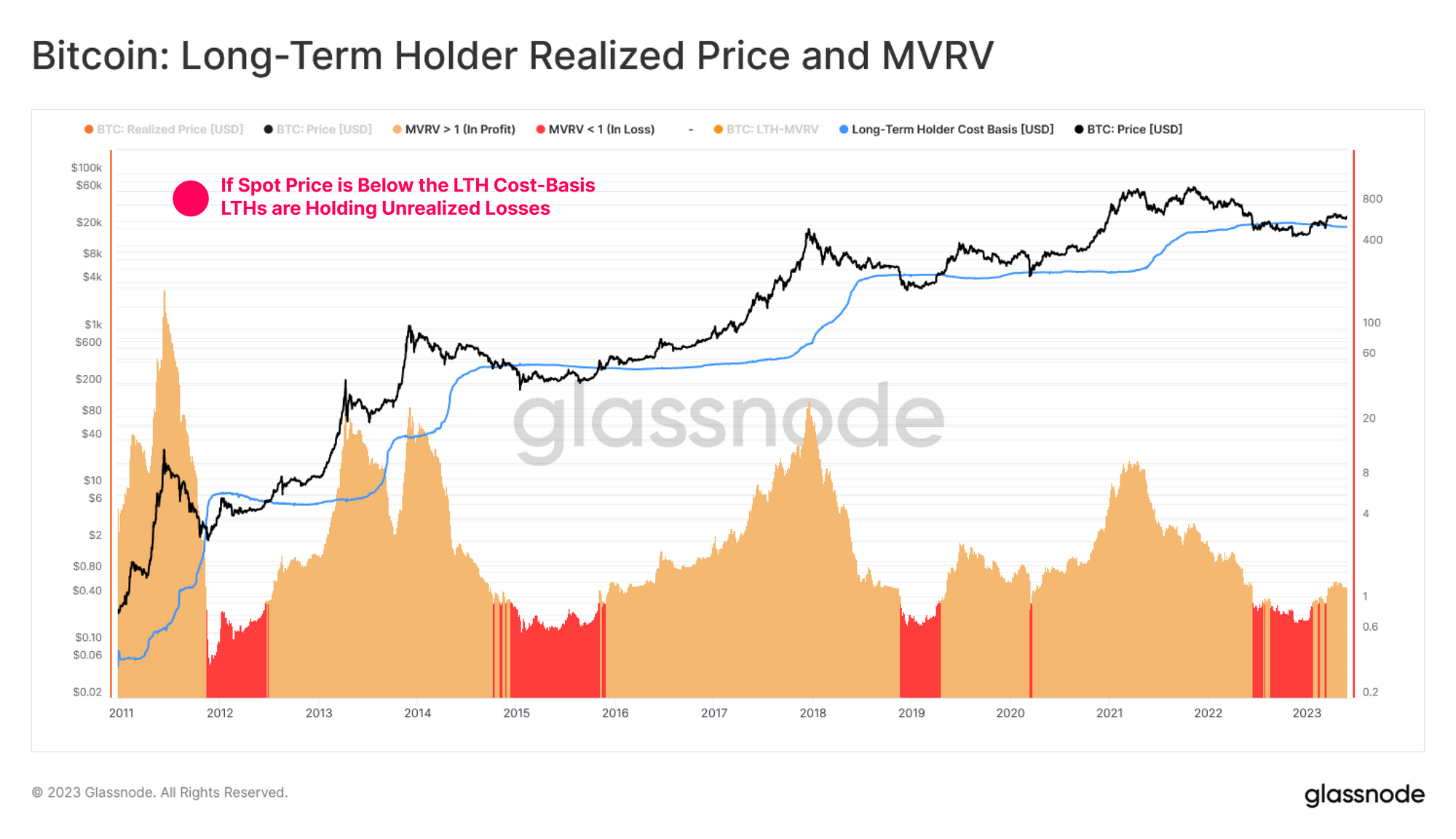 In aggregate, we can compare the deviation between spot price and the LTH average acquisition price via the LTH-MVRV metric. This provides insight into the magnitude unrealized profit or loss they collectively hold. From this we develop a simple tool to check whether LTHs are under unrealized stress: