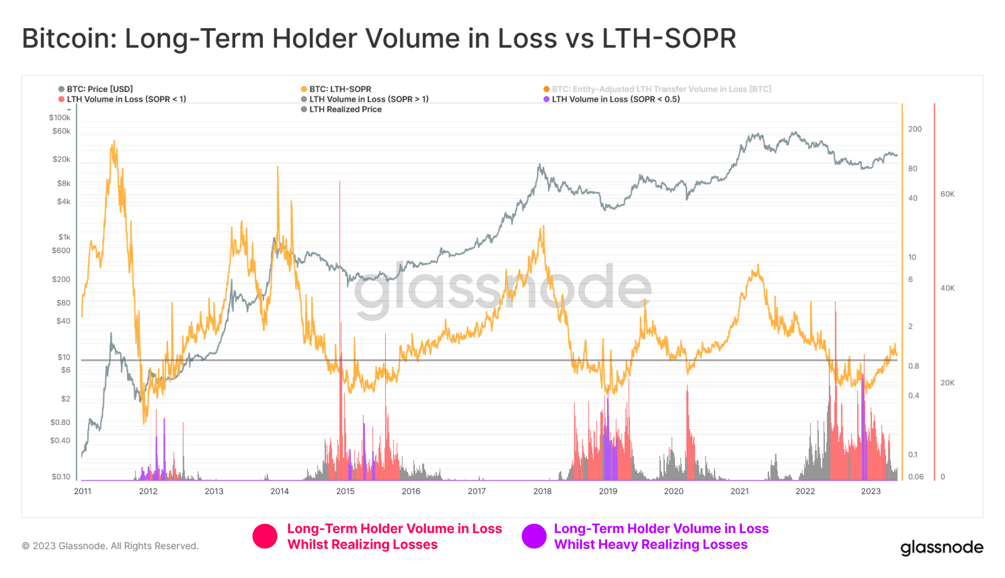 - Realized Stress: being the actualized losses taken by coins spent by the LTH cohort, reflecting true capitulation events. This can be monitored using LTH-SOPR, Realized Loss, and Spent Volume in Loss.