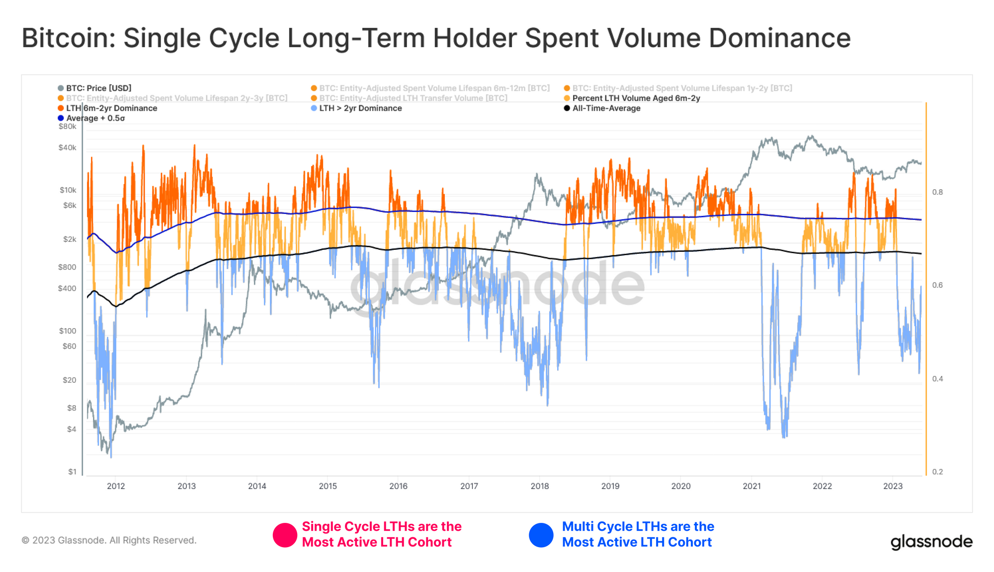 - 🔵 Single cycle LTH volume dominance exceeds 0.5 standard deviations from the mean. This indicates that the majority of LTH volume (which is contributing to LTH-SOPR) is indeed sourced from the least experienced of the cohort (signifying the least experienced).
